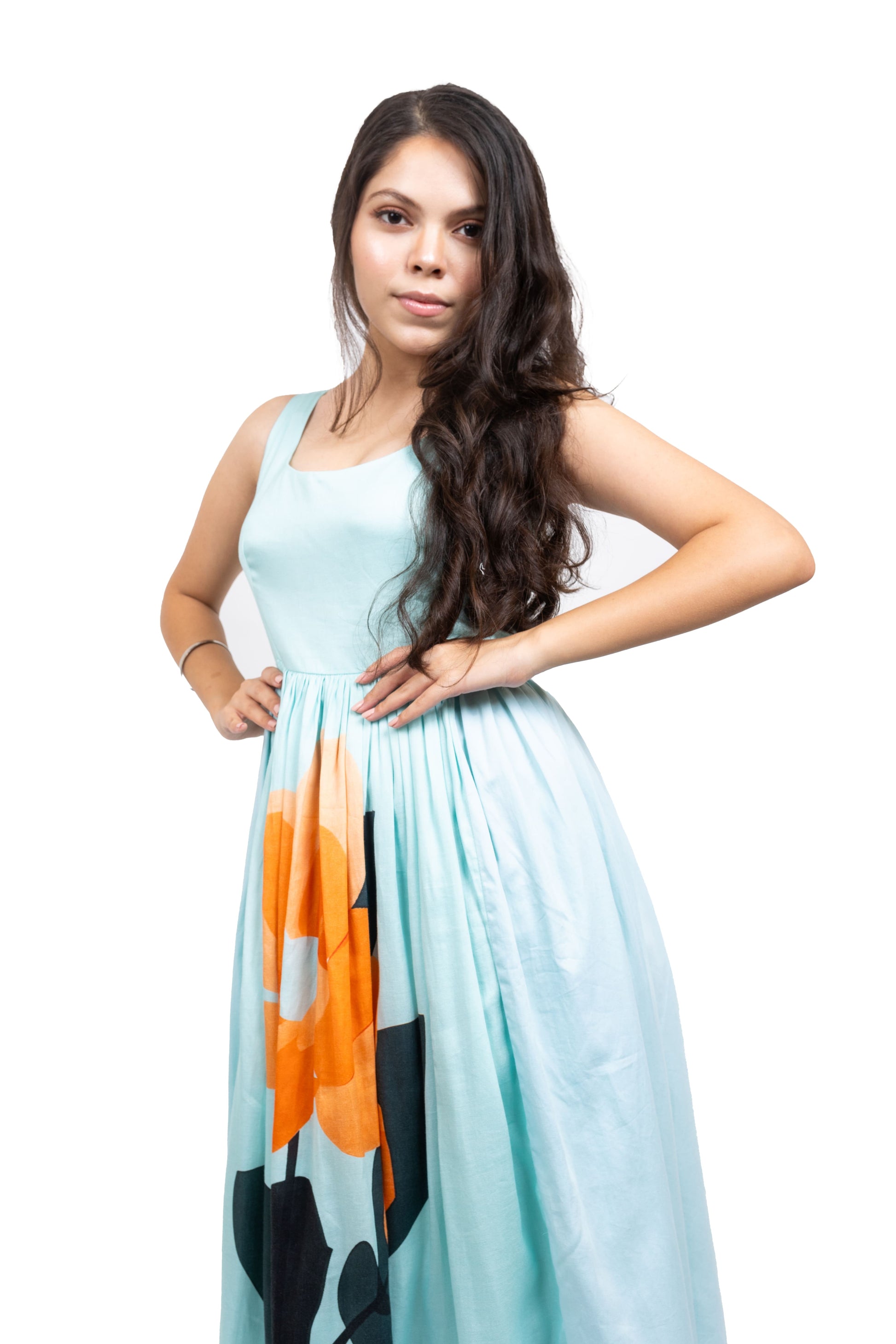 This dress in aqua blue boasts a beautiful statement print. Sleeveless with a round neck and a side zip, it features a stunning flare of gathers, creating an elegant and eye-catching silhouette.