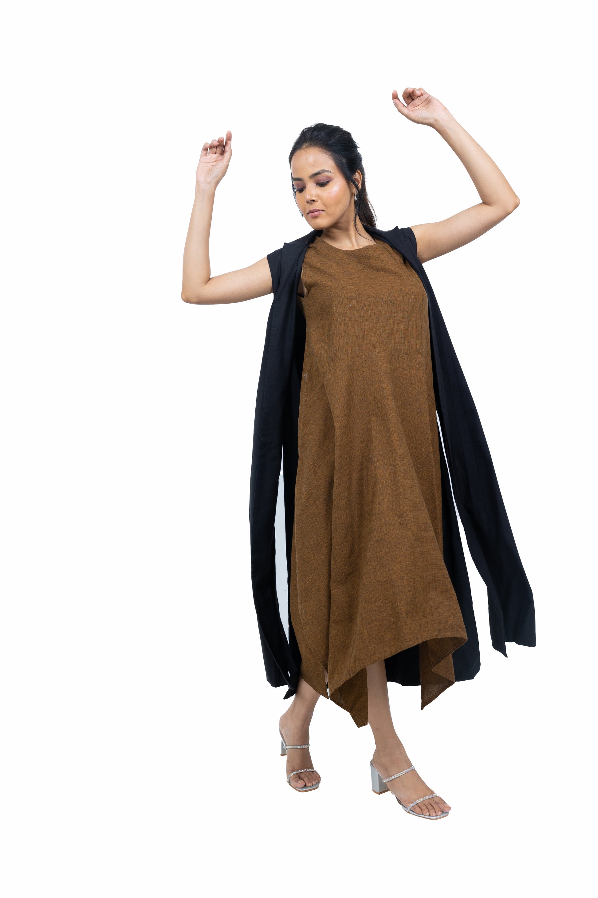 Add an edge to your look with this sleek black jacket, featuring high side slits and a sharp notch collar. Paired perfectly with our asymmetric handloom dress, designed with a unique cut, this set is a modern statement of effortless style.