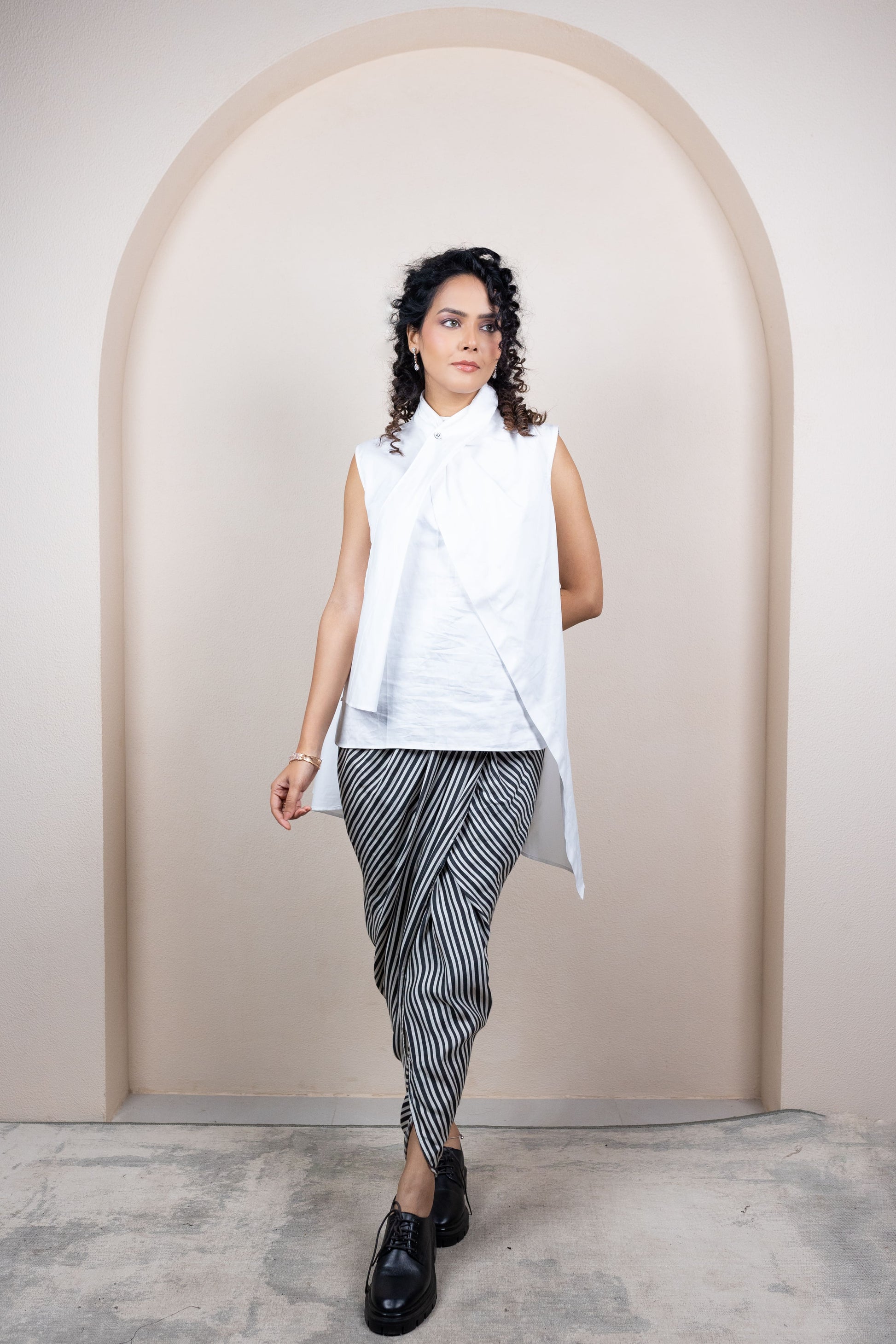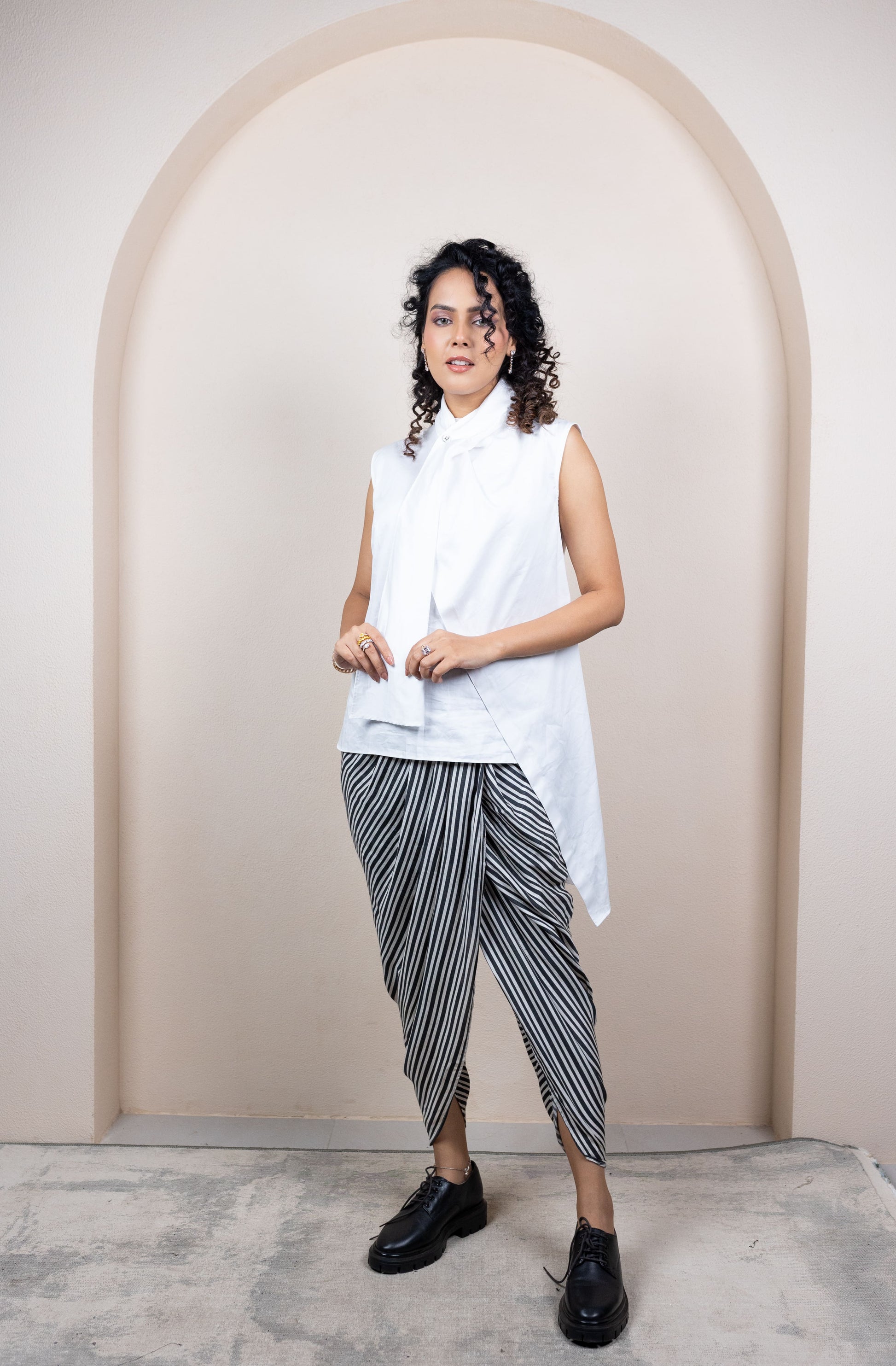 A modern twist on classic tailoring, this asymmetric white shirt with attached scarf detail is paired with black-and-white draped striped pants. A bold festive ensemble for the fashion-forward.