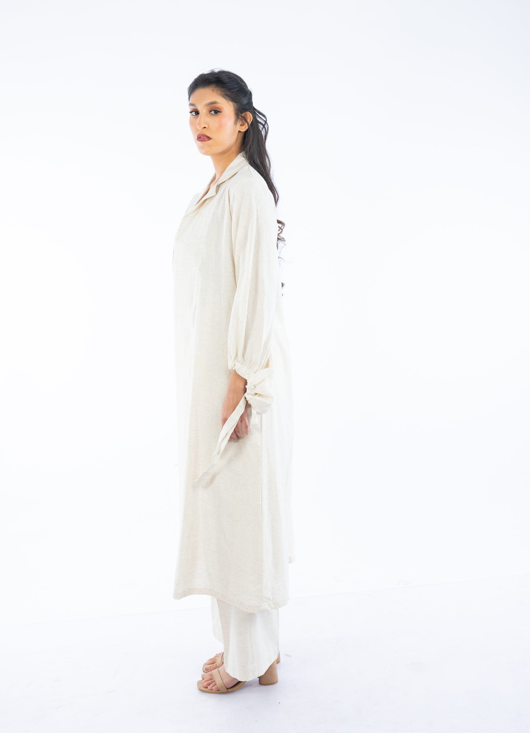 This beige handloom set is the perfect blend of style and versatility. The balloon-sleeved jacket adds a unique flair, while the straight-fit pants offer a clean and polished look. Paired with a pleated top, this set is effortlessly chic and ideal for both casual outings and sophisticated gatherings.