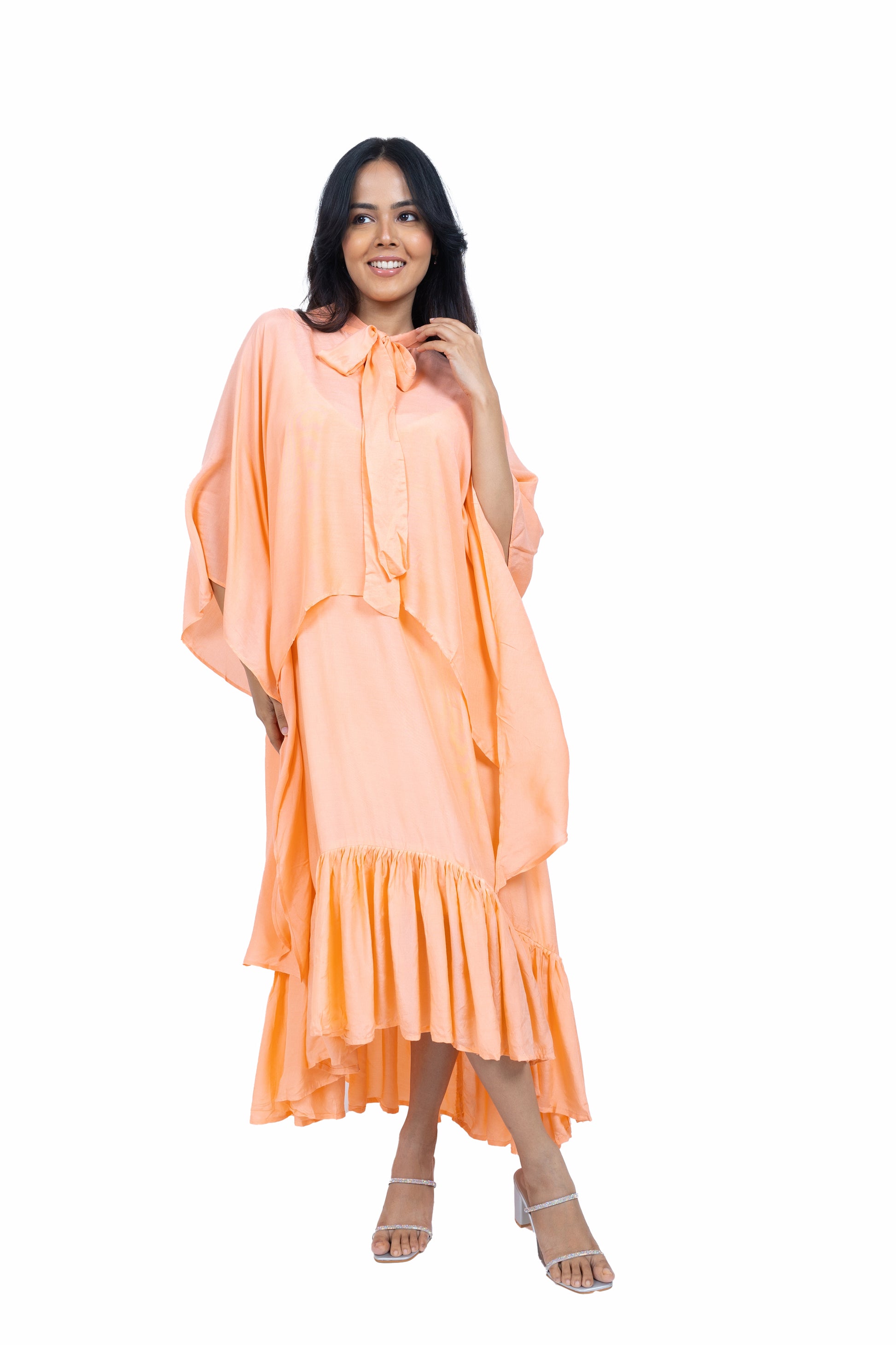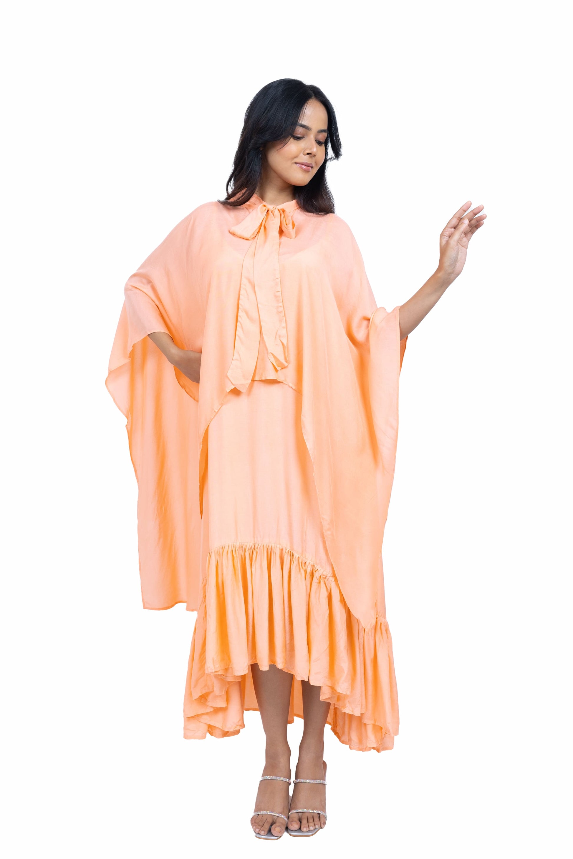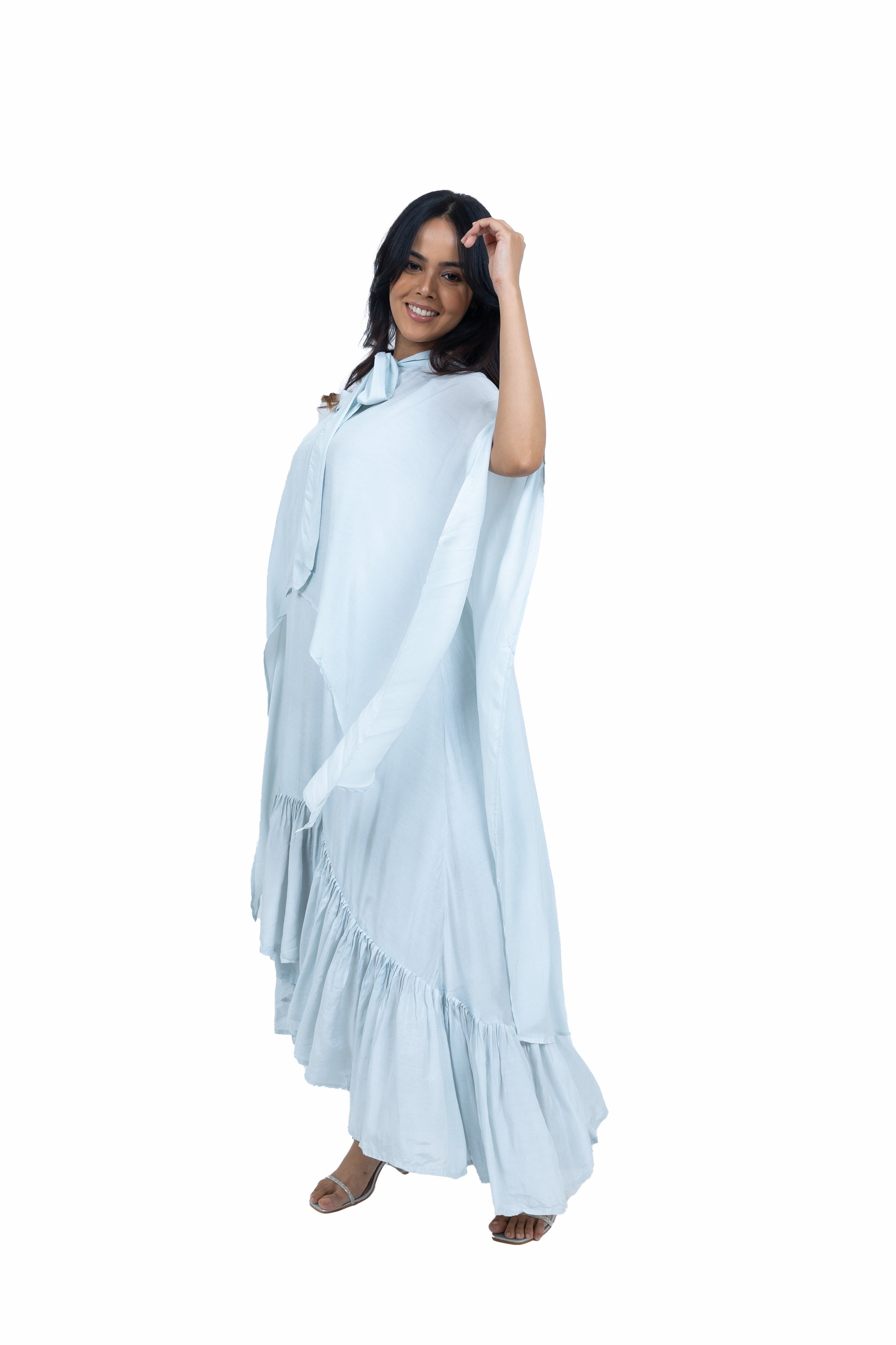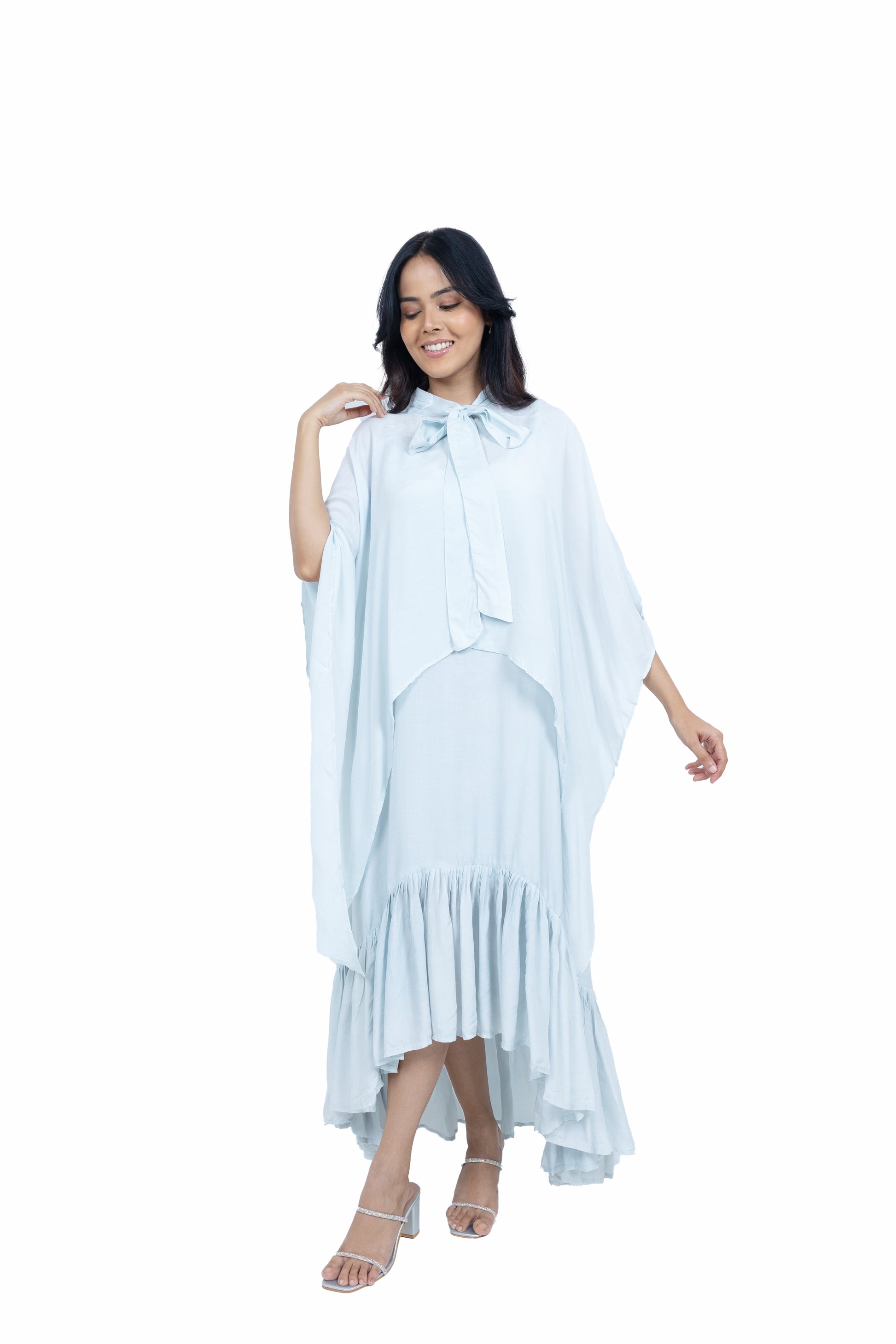 Flow effortlessly in this long asymmetric dress crafted from soft muslin fabric. Featuring a chic spaghetti strap design paired with a stunning cape, this ensemble exudes elegance and charm, perfect for making a statement at any occasion