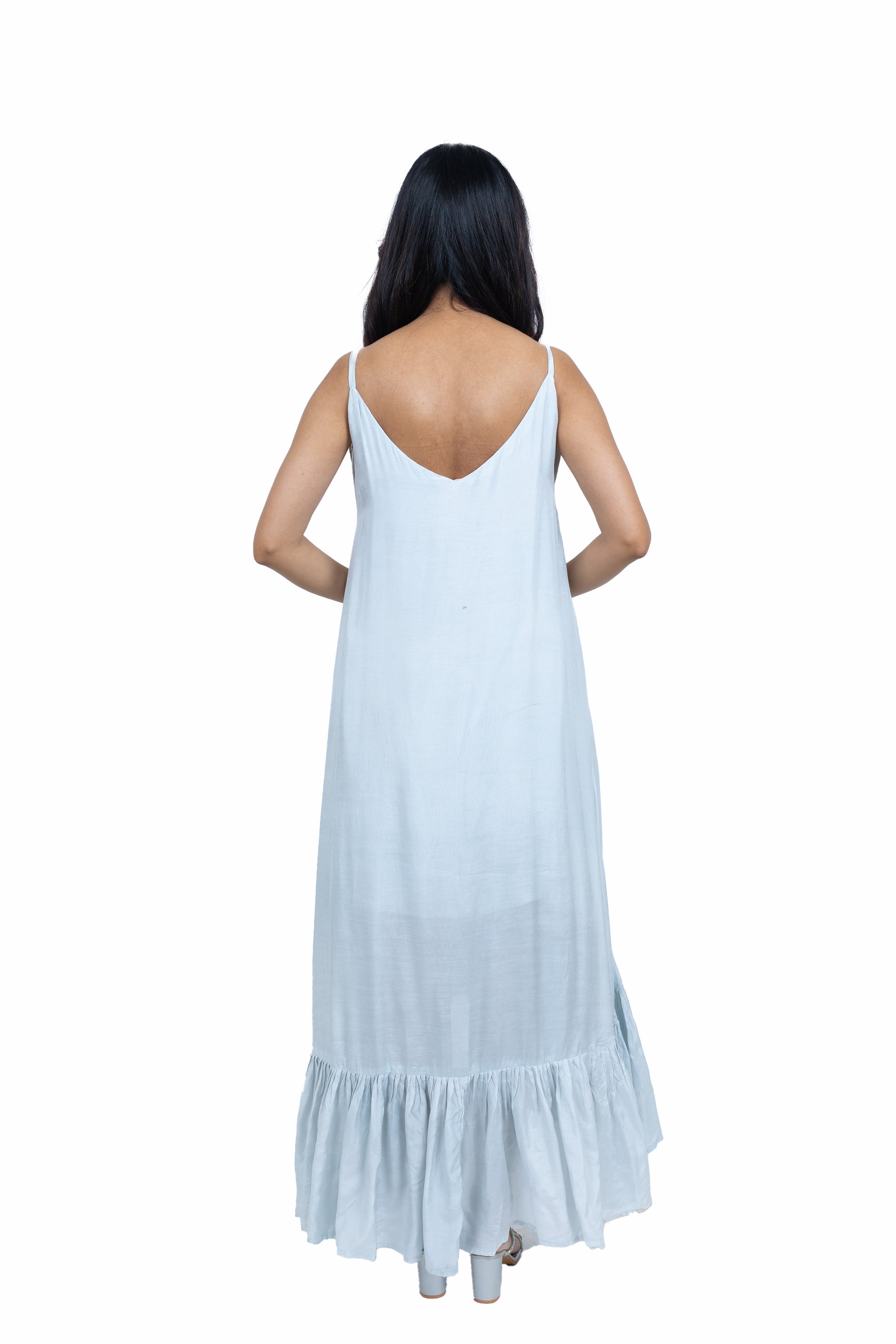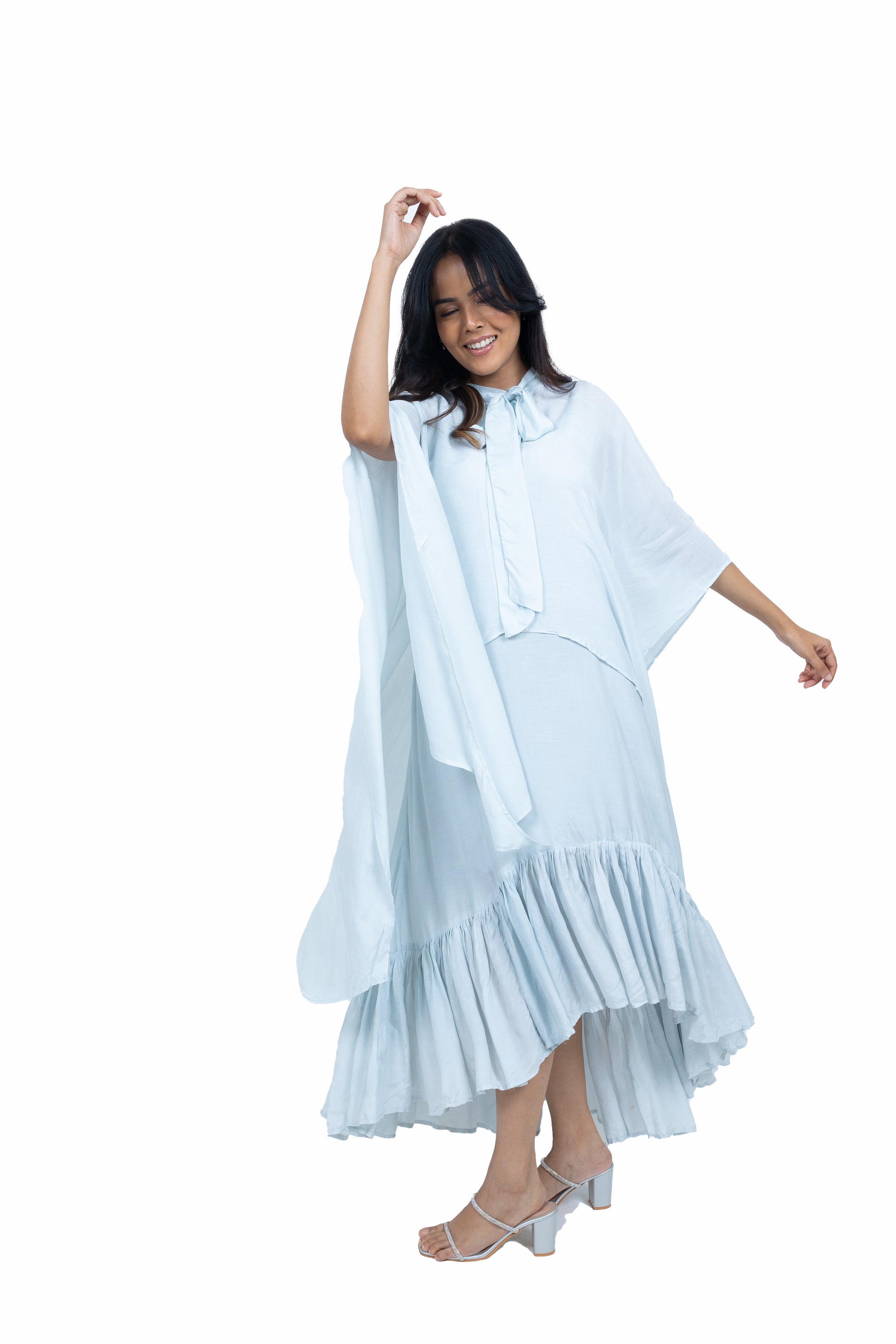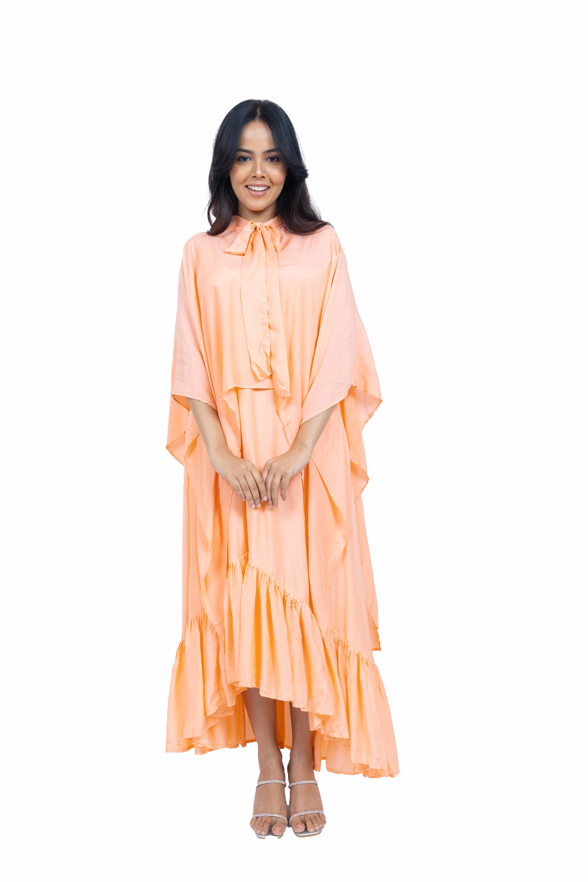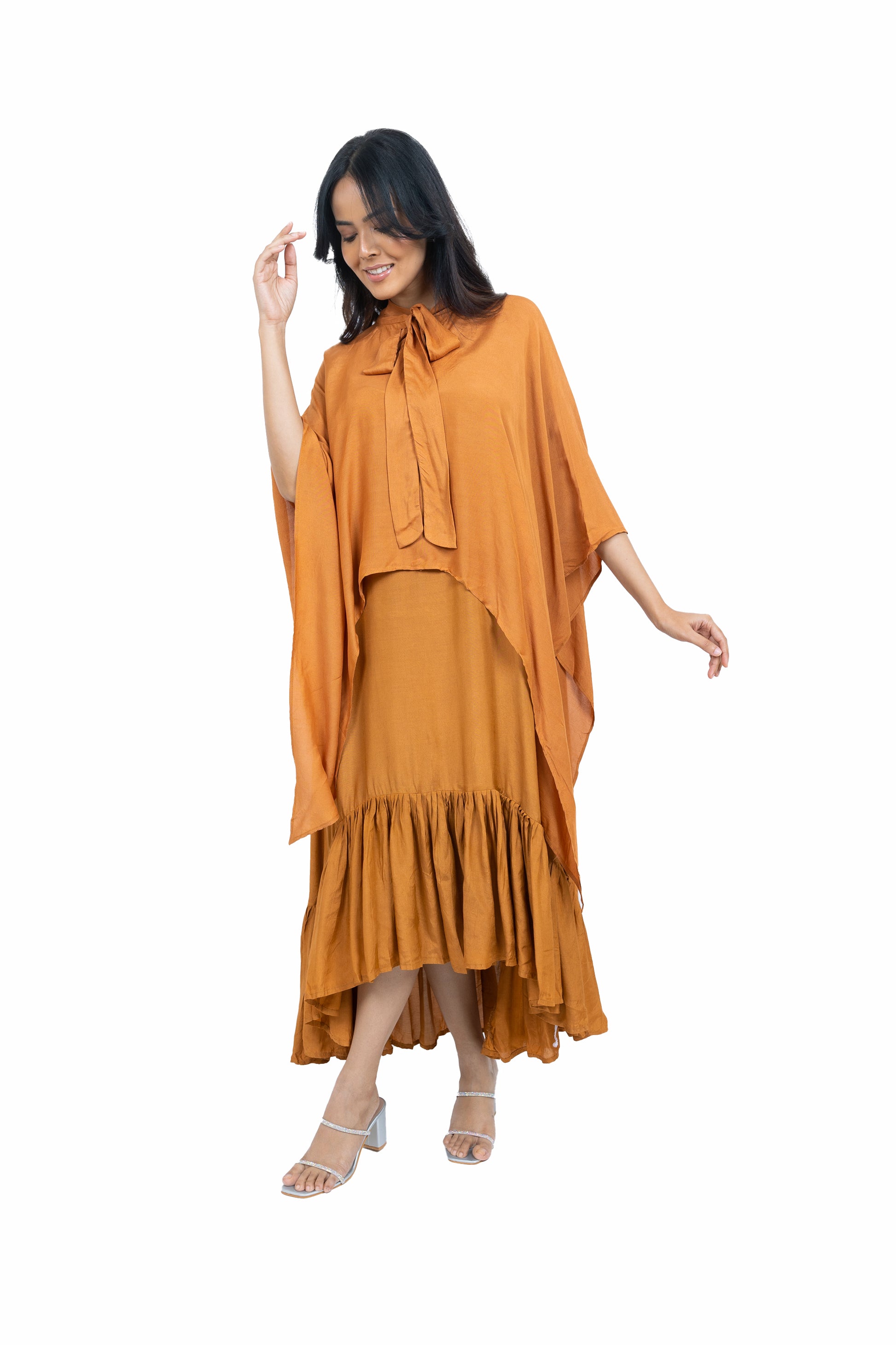 Flow effortlessly in this long asymmetric dress crafted from soft muslin fabric. Featuring a chic spaghetti strap design paired with a stunning cape, this ensemble exudes elegance and charm, perfect for making a statement at any occasion