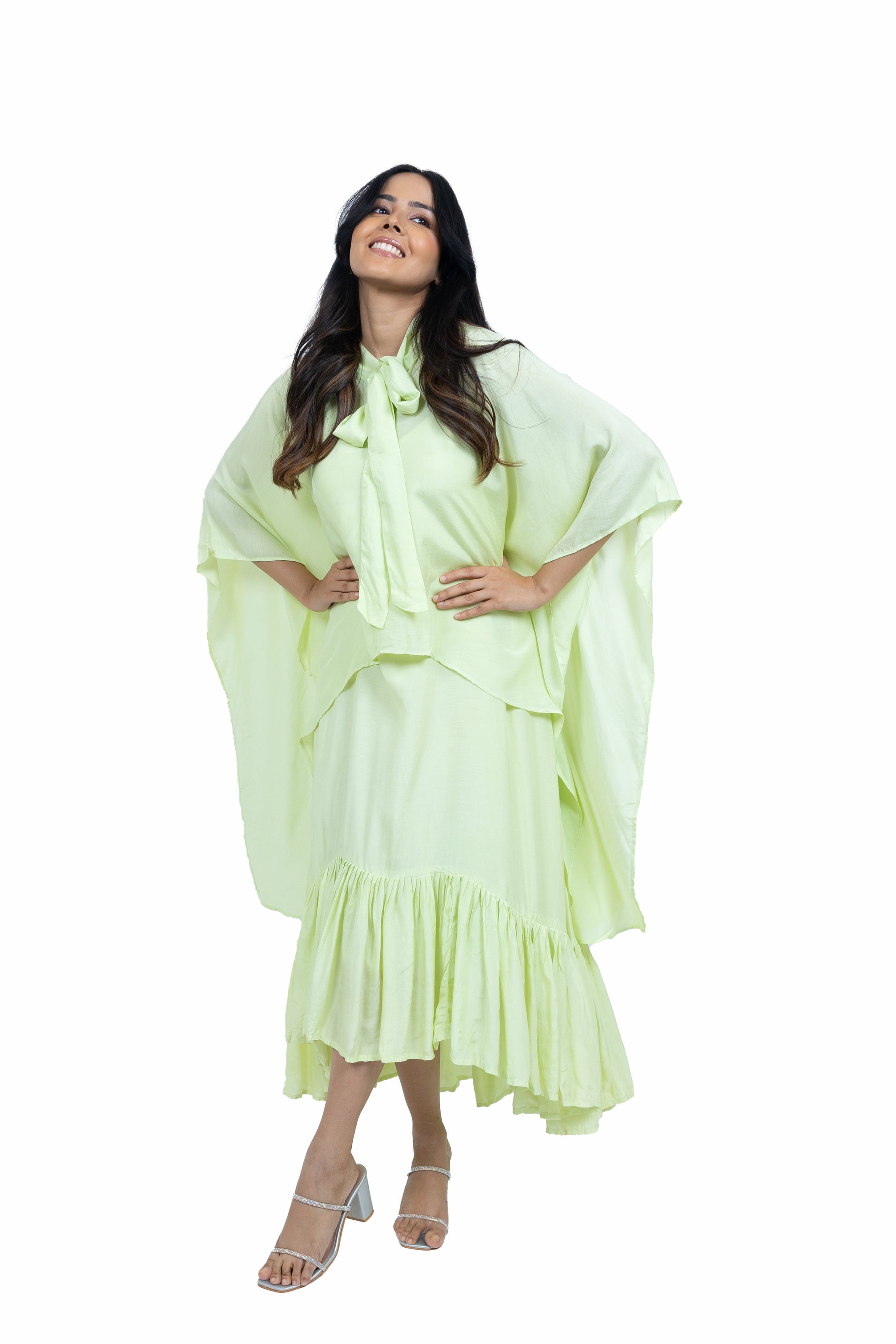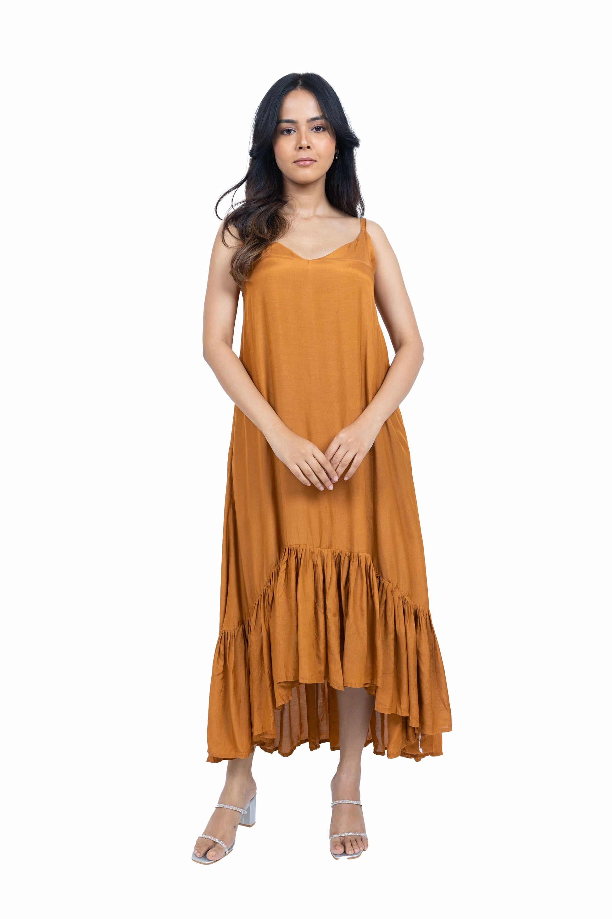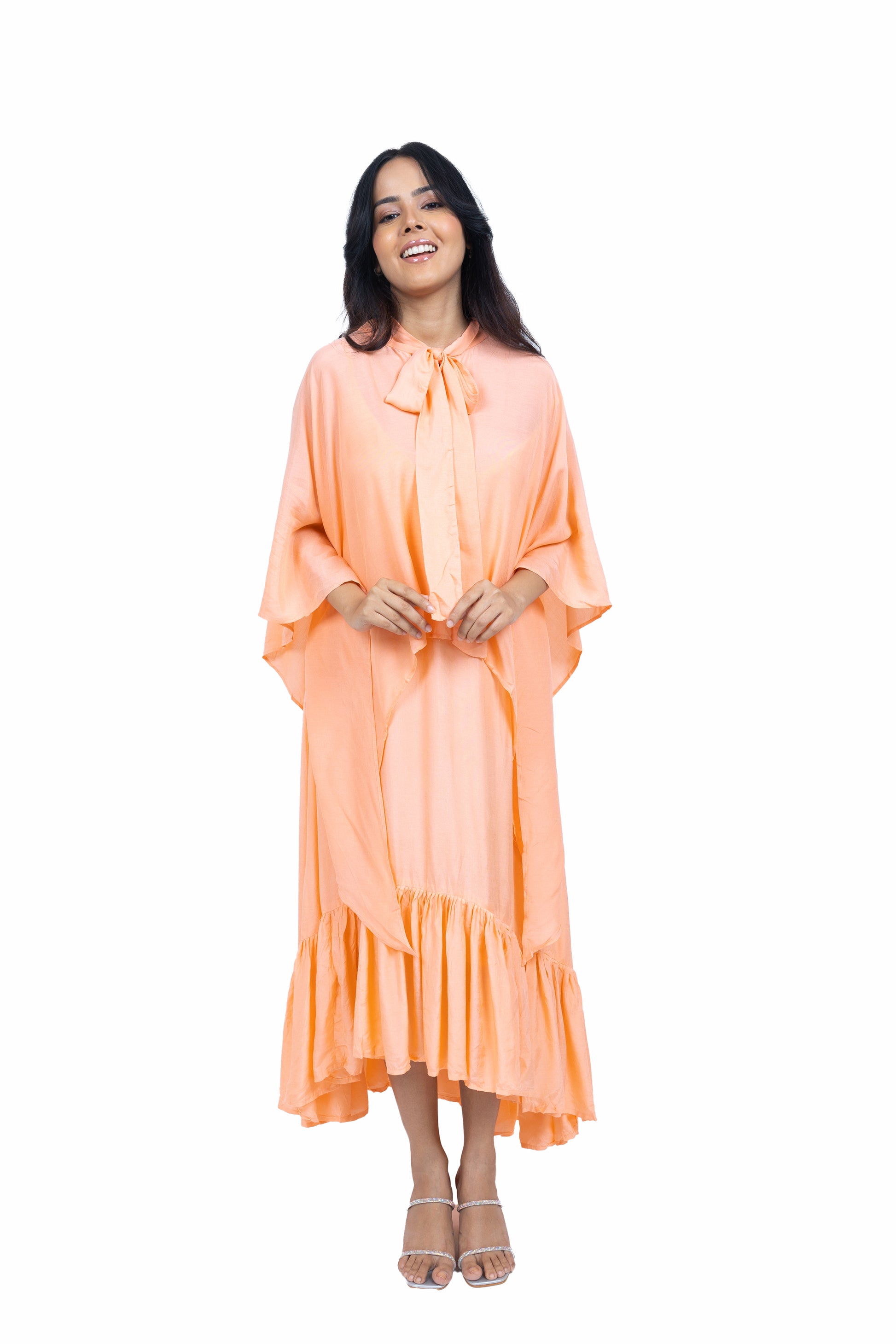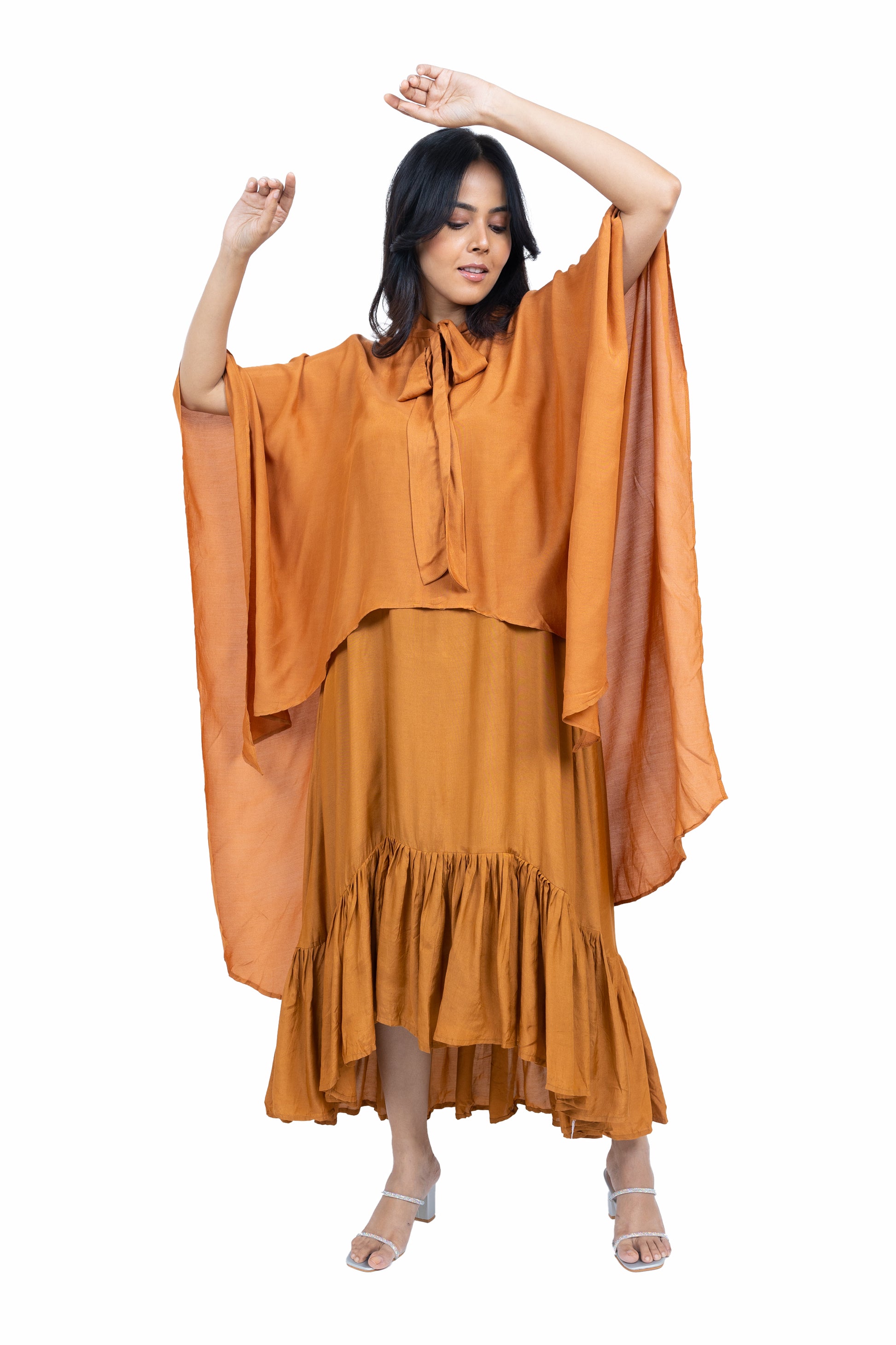 Flow effortlessly in this long asymmetric dress crafted from soft muslin fabric. Featuring a chic spaghetti strap design paired with a stunning cape, this ensemble exudes elegance and charm, perfect for making a statement at any occasion