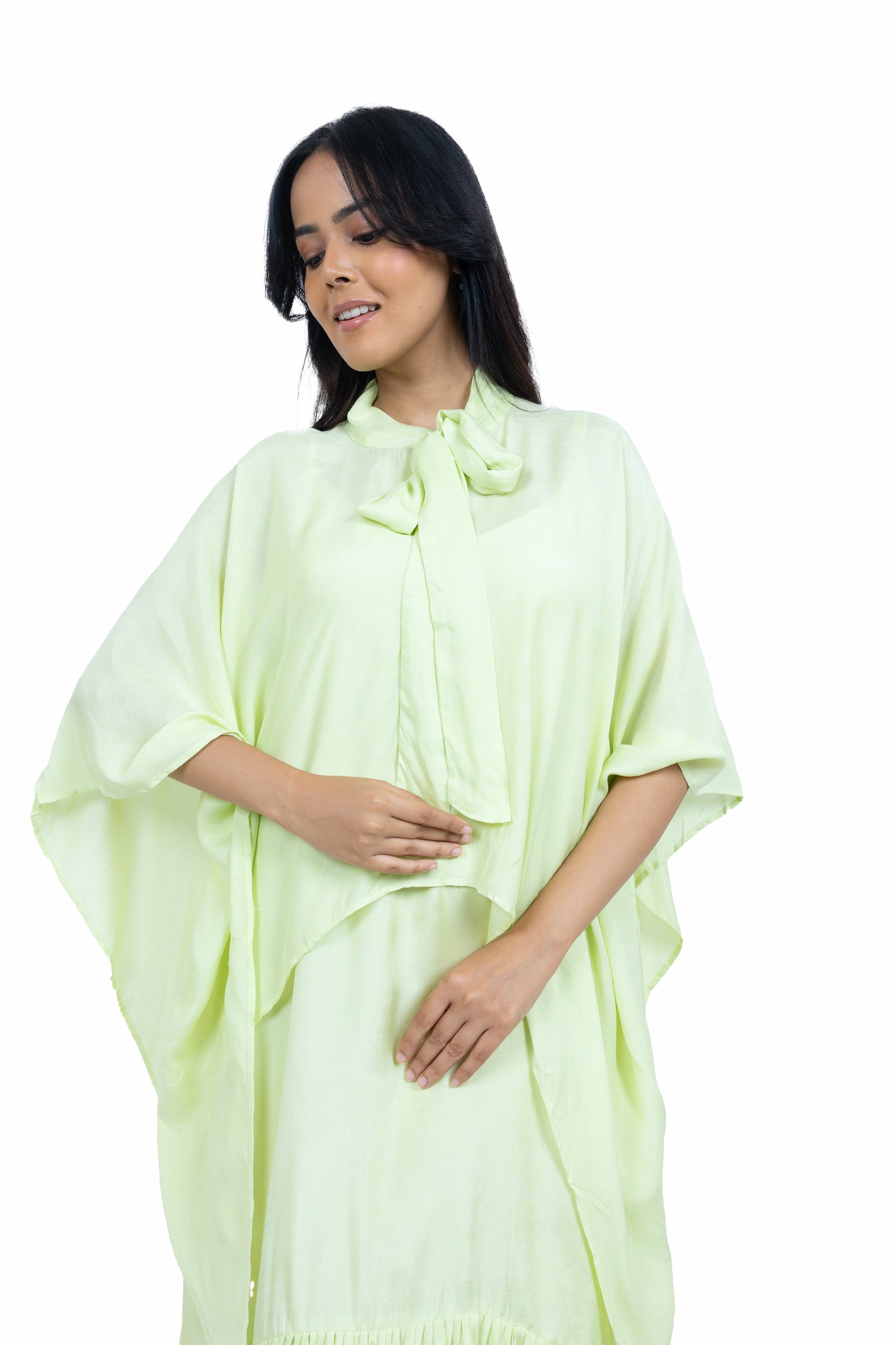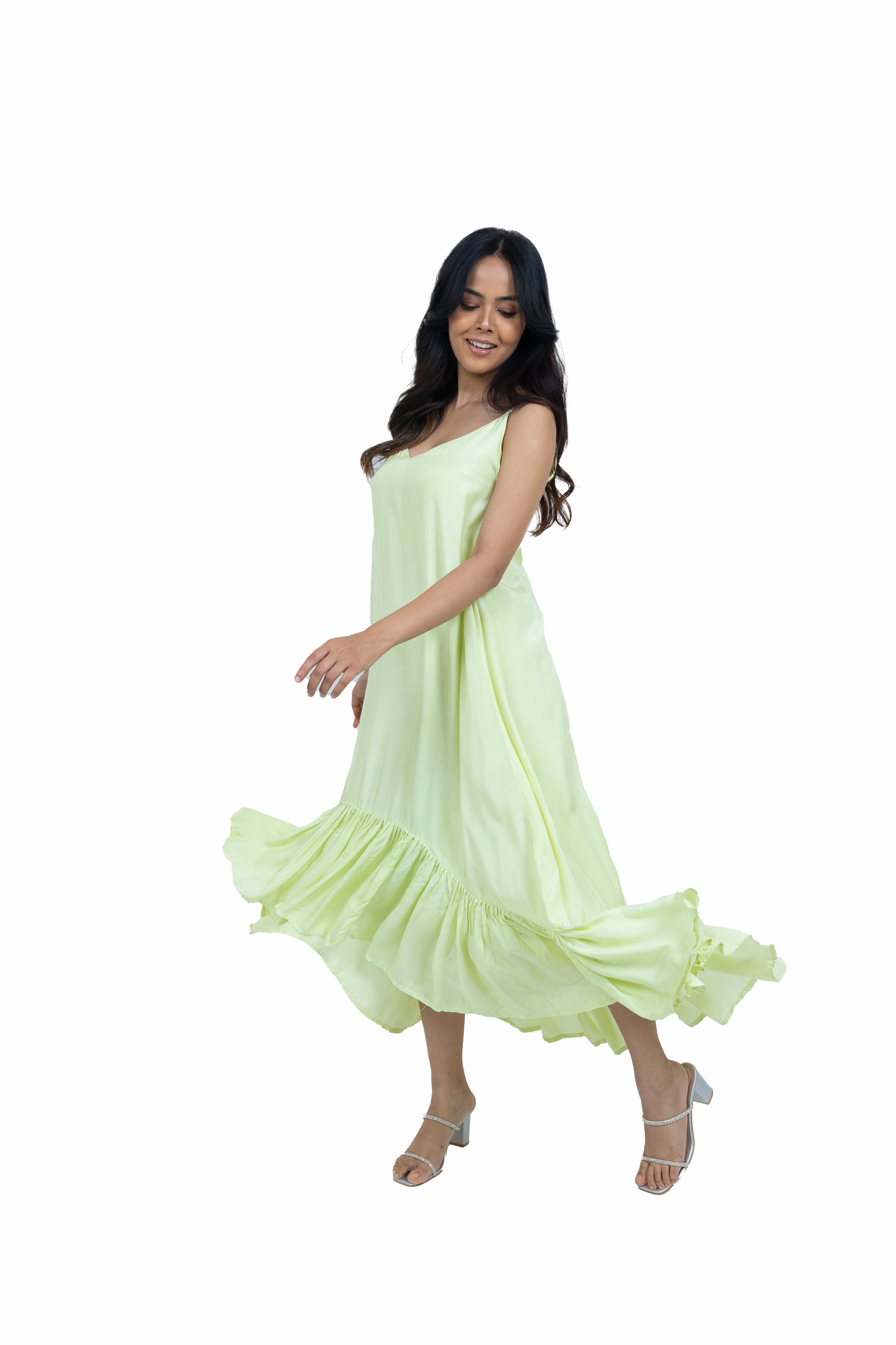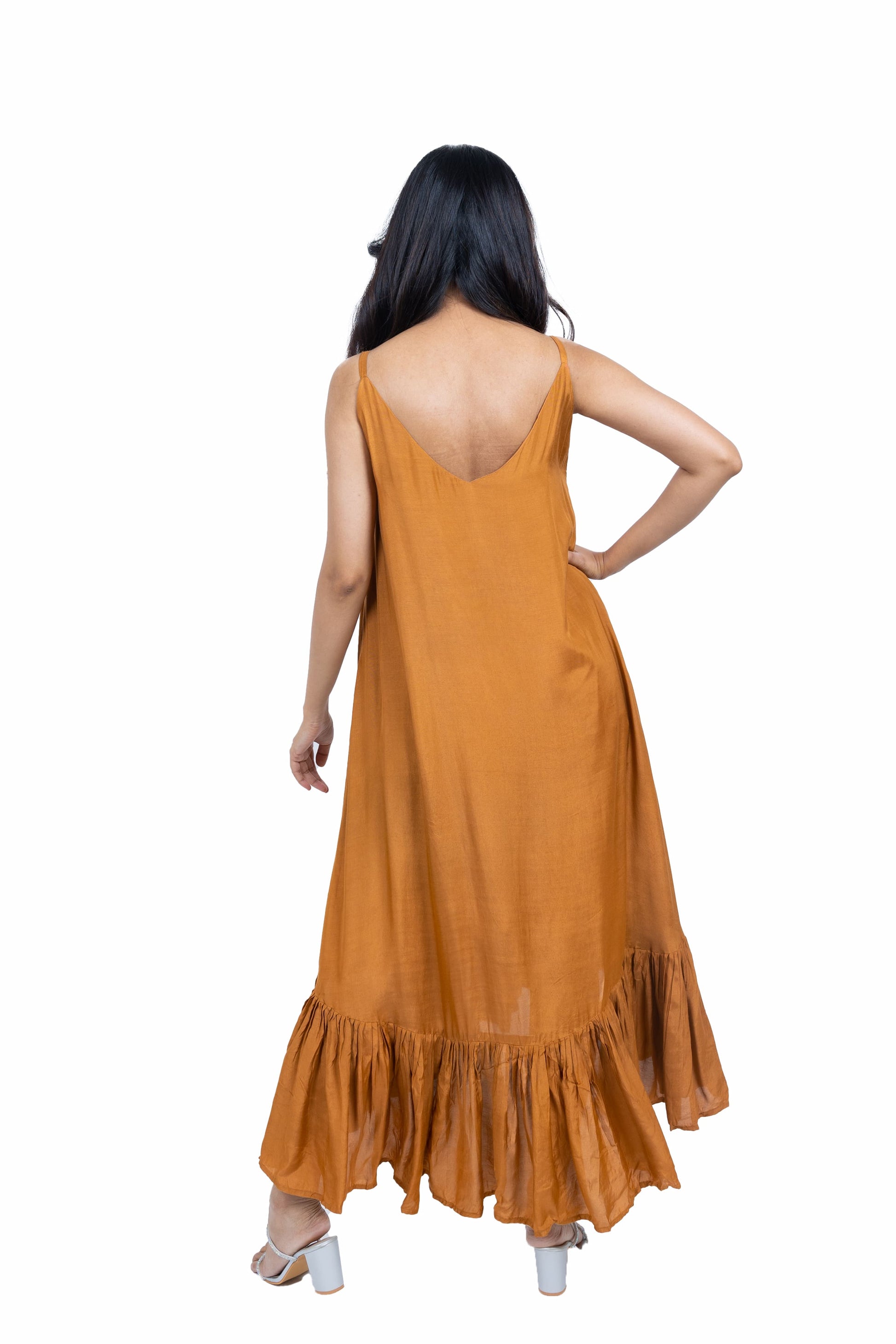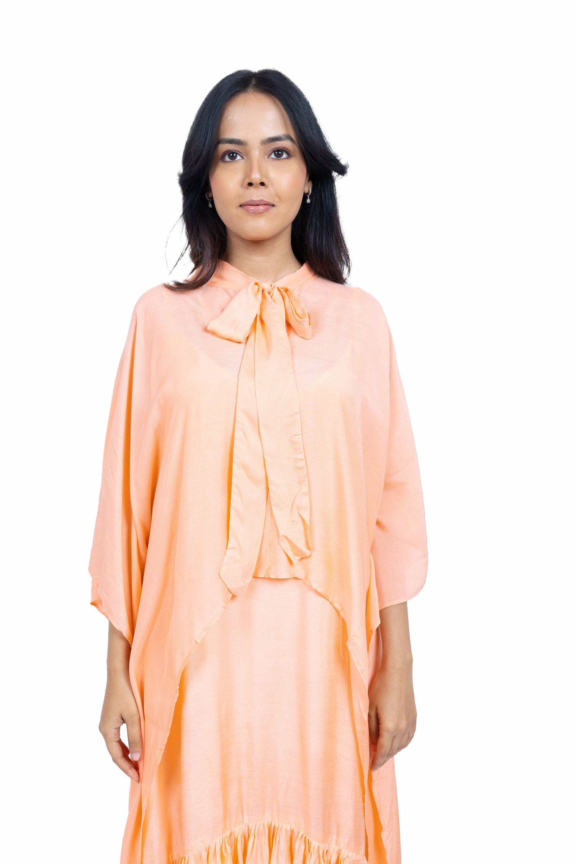 Flow effortlessly in this long asymmetric dress crafted from soft muslin fabric. Featuring a chic spaghetti strap design paired with a stunning cape, this ensemble exudes elegance and charm, perfect for making a statement at any occasion