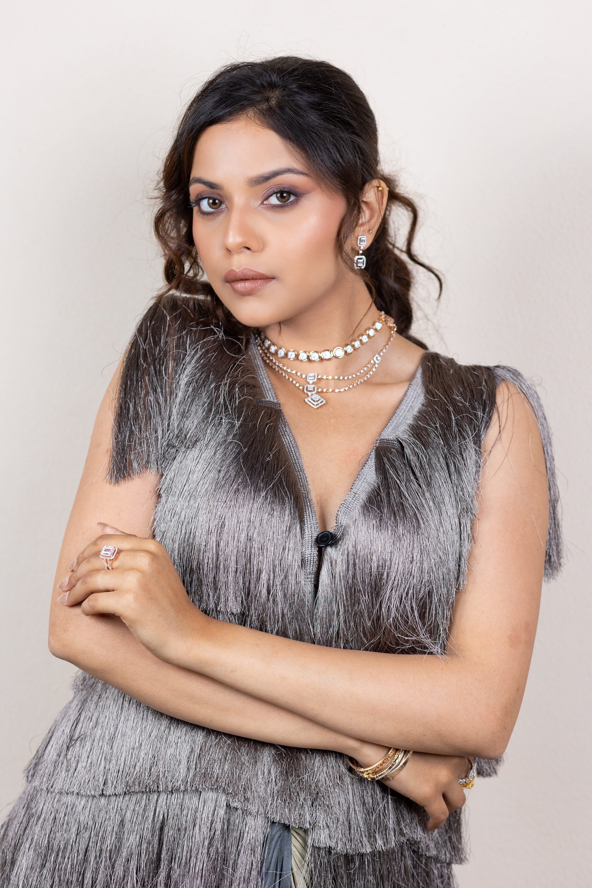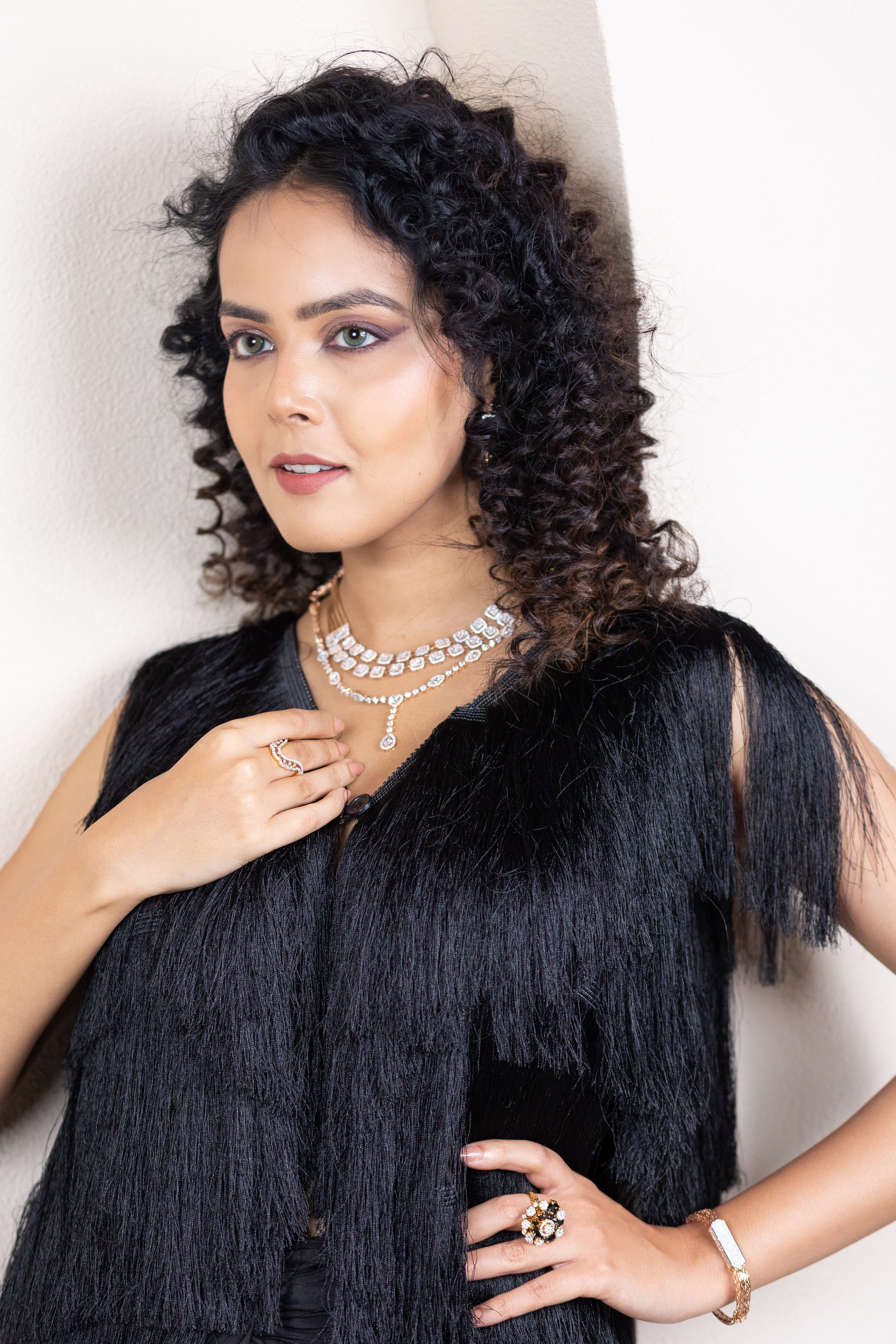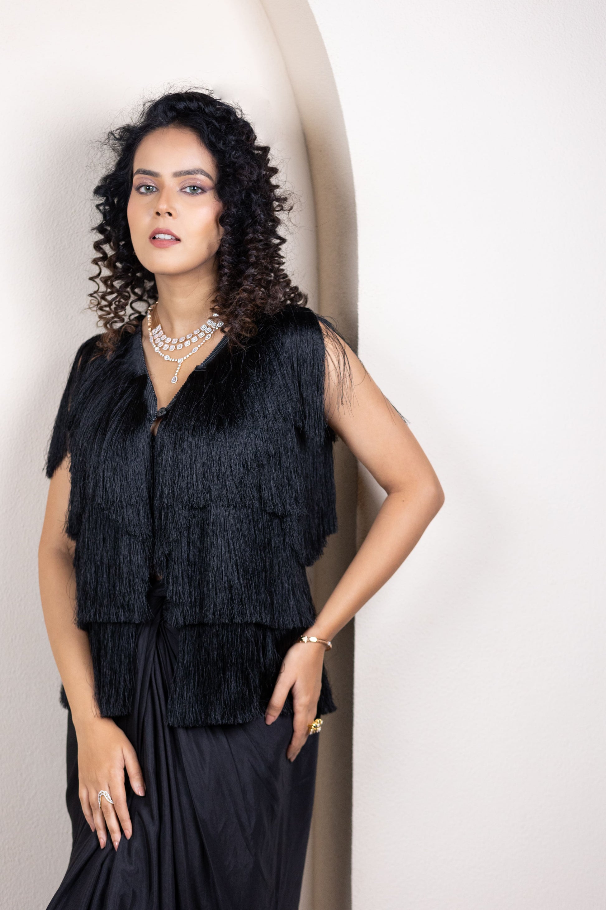 Dramatic and striking, the layered fringe jacket exude timeless glamour. An evening-ready outfit designed for festive celebrations.