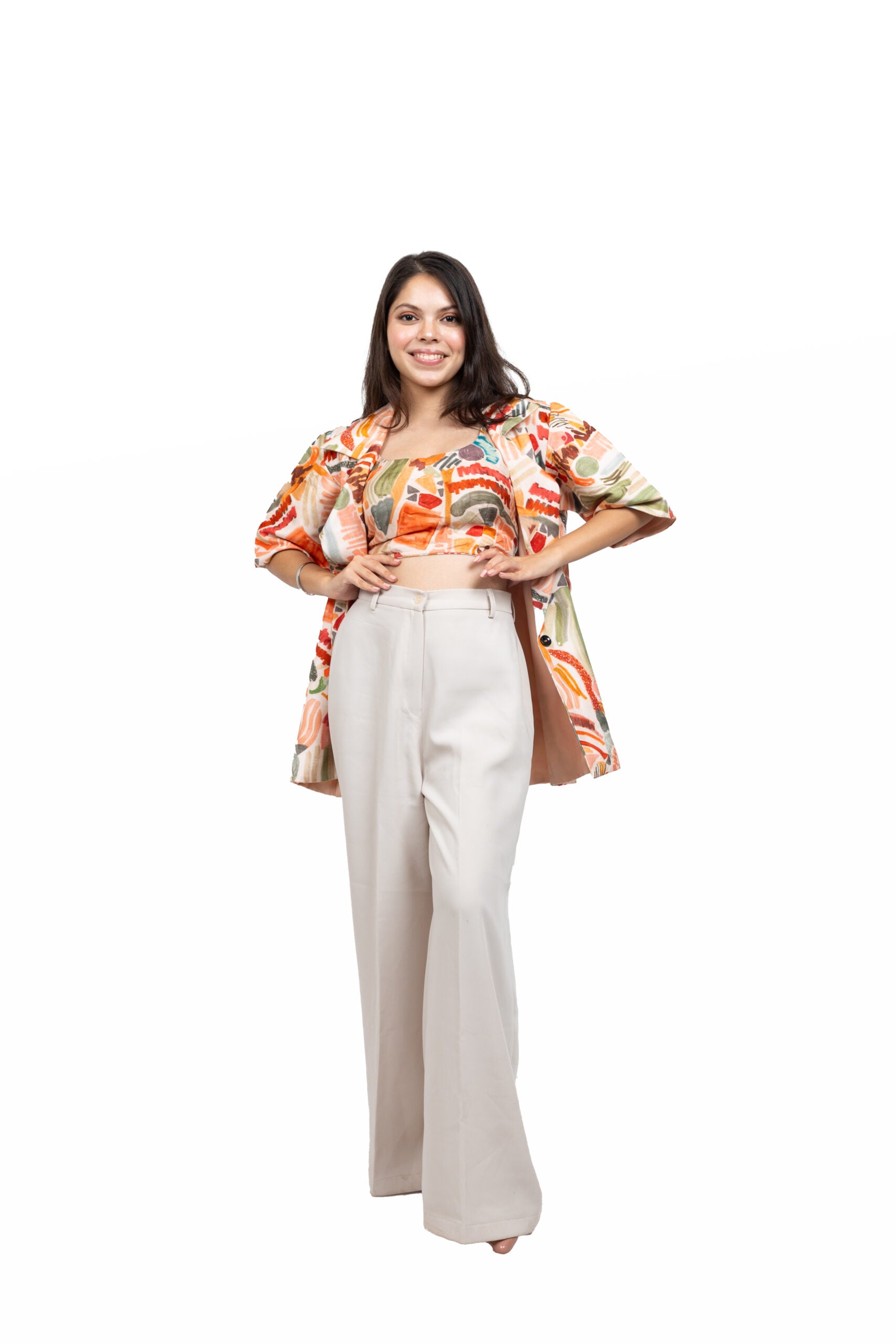 This box-fit loose blazer features beautiful prints and intricately crafted embellishments. it has short sleeves for a relaxed look and comes with a cute bustier with adjustable straps for a customizable fit.