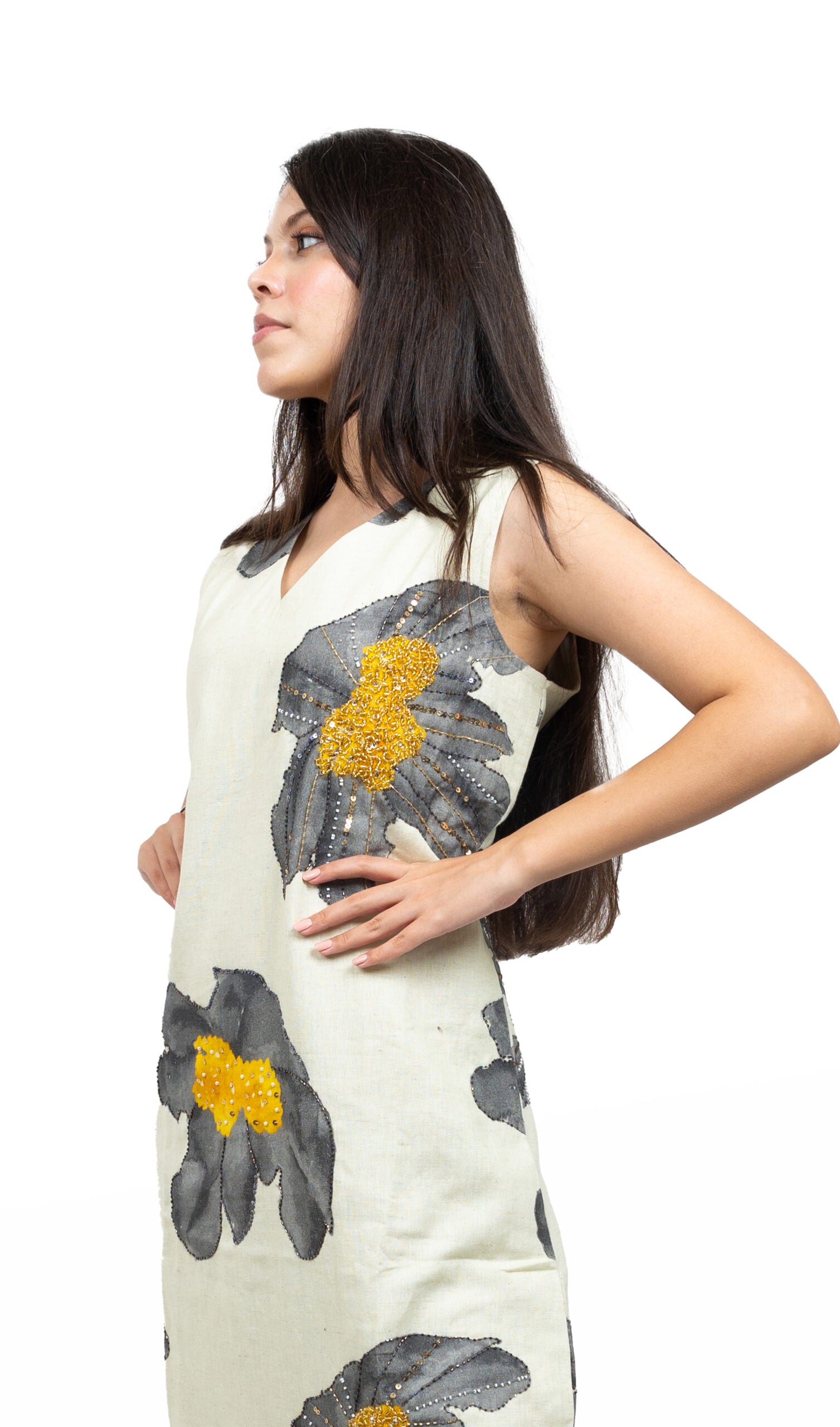 This long one-piece dress showcases beautiful floral prints and intricate handwork with embellishments. Carefully crafted with a V-neck and a high side slit, it offers a perfect blend of elegance and style.
