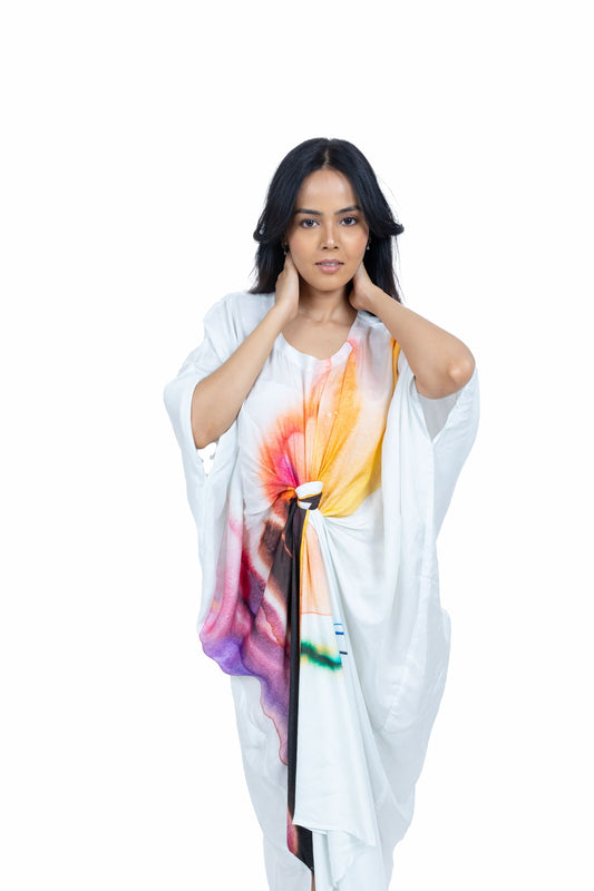Beautiful Printed Muslin Kaftan, a uniquely crafted piece that exudes elegance. The freesize design ensures a comfortable fit for all. The intricately crafted knot at the front creates a beautiful effect, and side slits add a touch of sophistication.