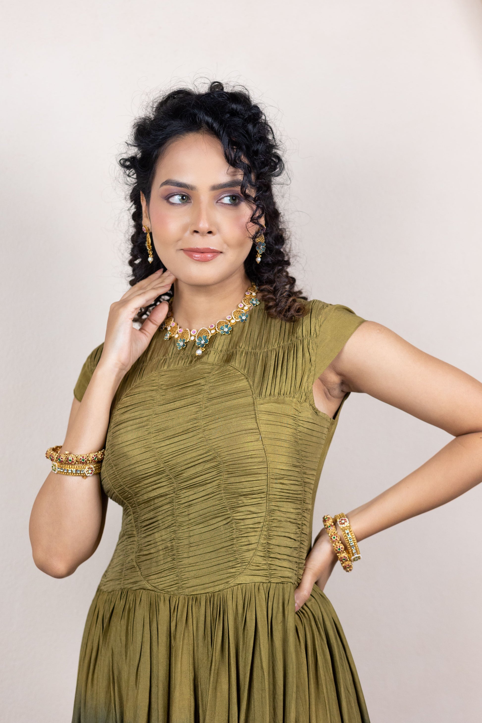 This olive-toned ruched bodice flows into a navy ombre draped skirt, creating a graceful fusion of earthy hues. A perfect choice for chic festive evenings.