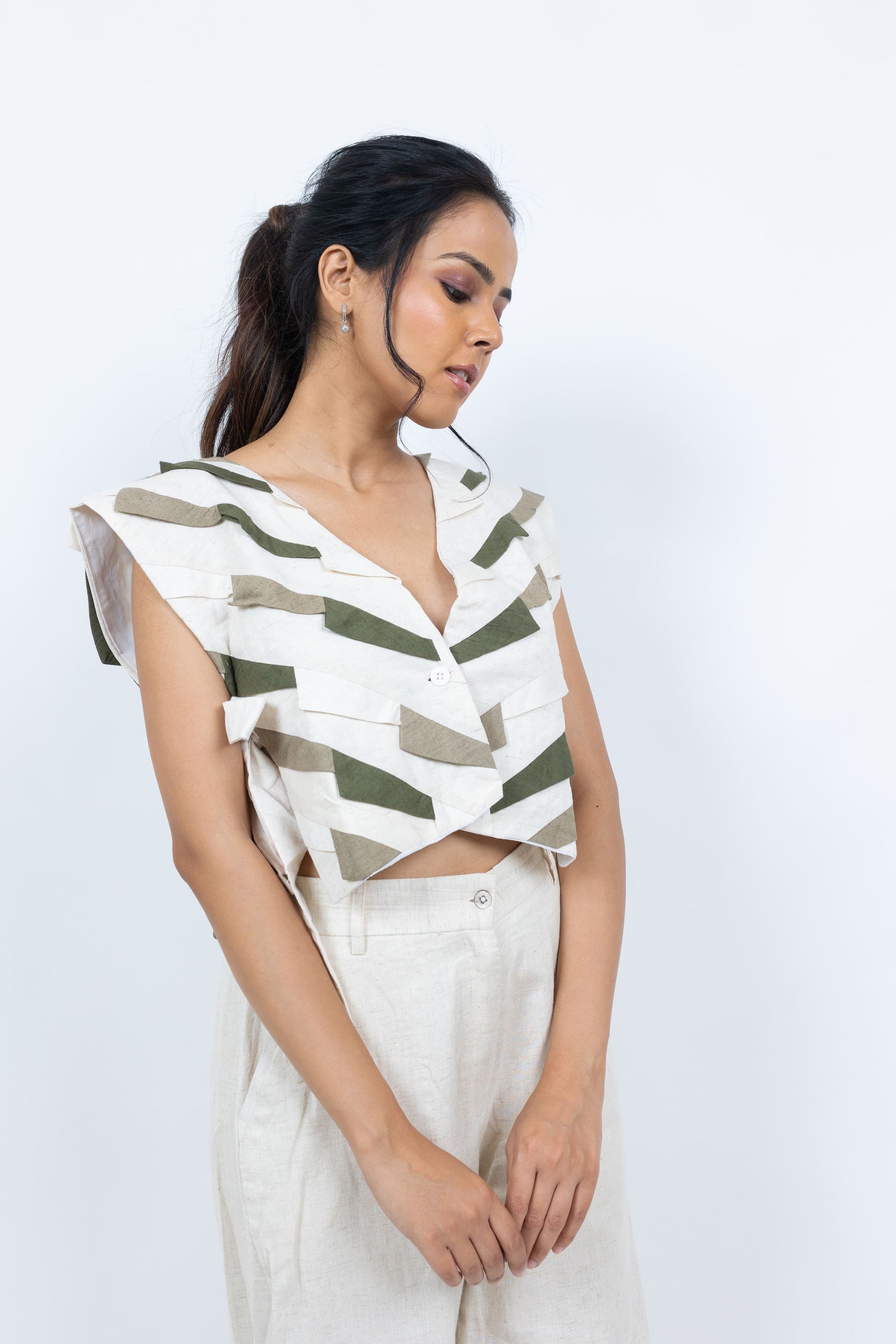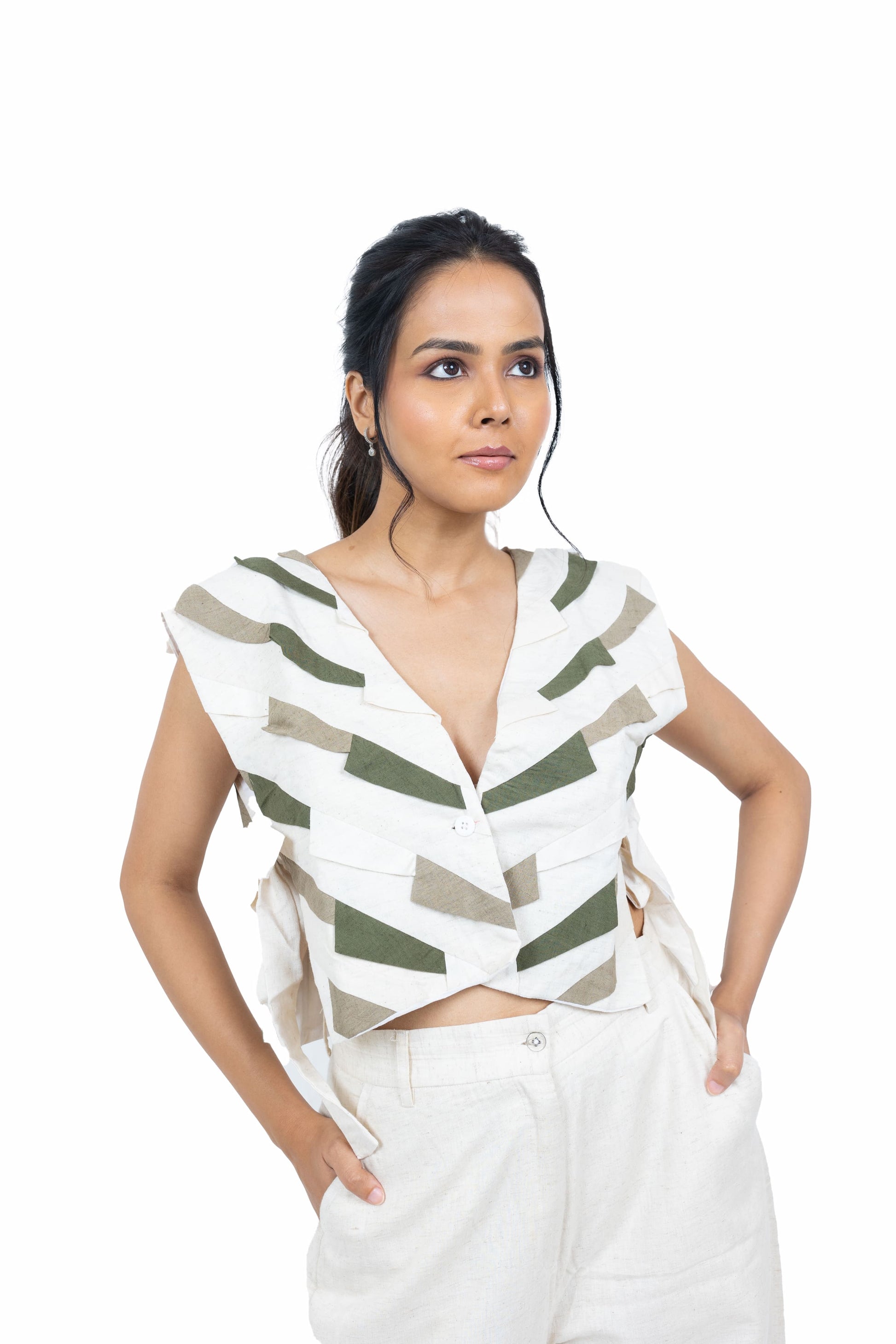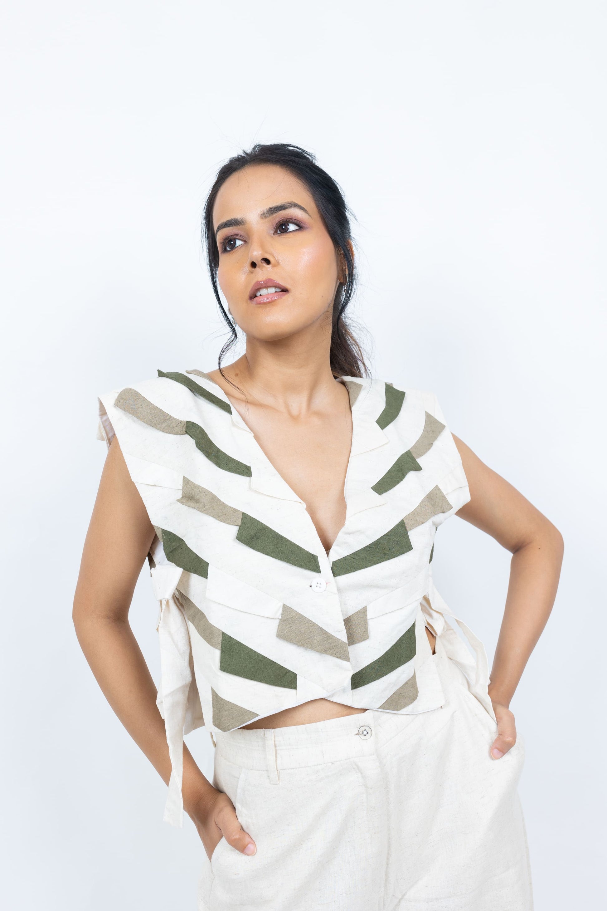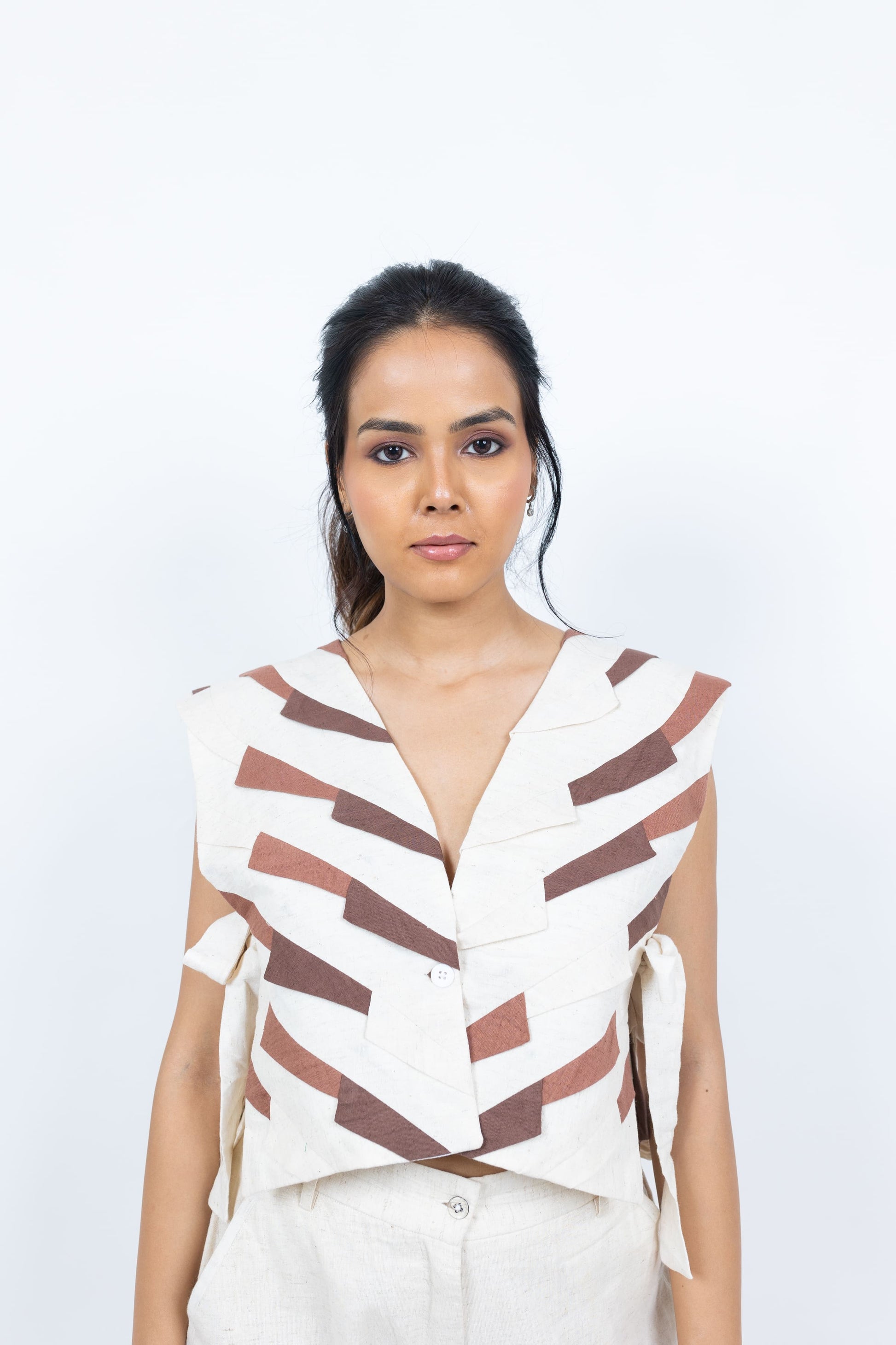 Elevate your wardrobe with this handcrafted handloom jacket, featuring striking patchwork in two-tone hues. Designed with a front button closure and side knots for a unique adjustable fit, it pairs beautifully with shirts, tops, or blouses for a chic layered look