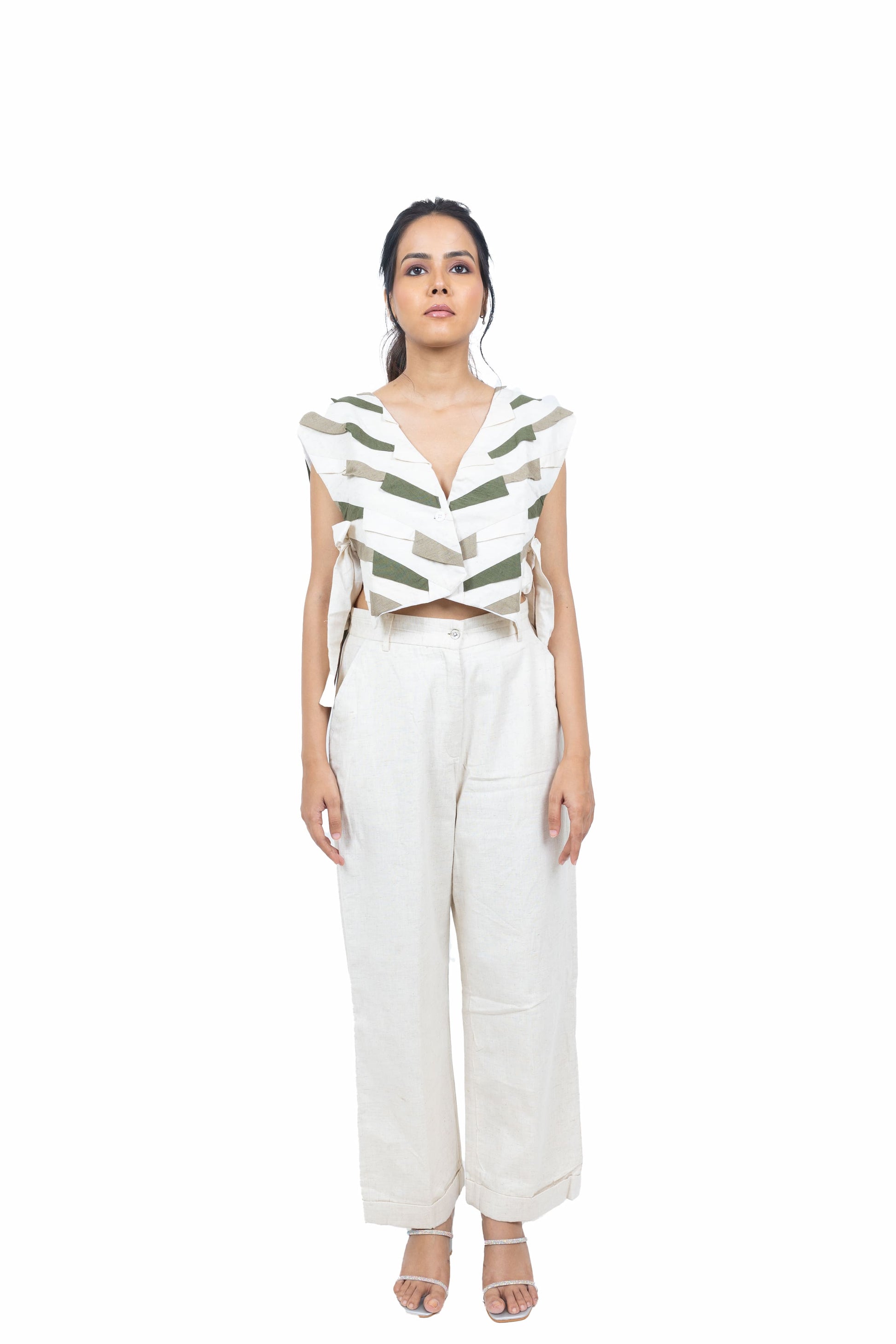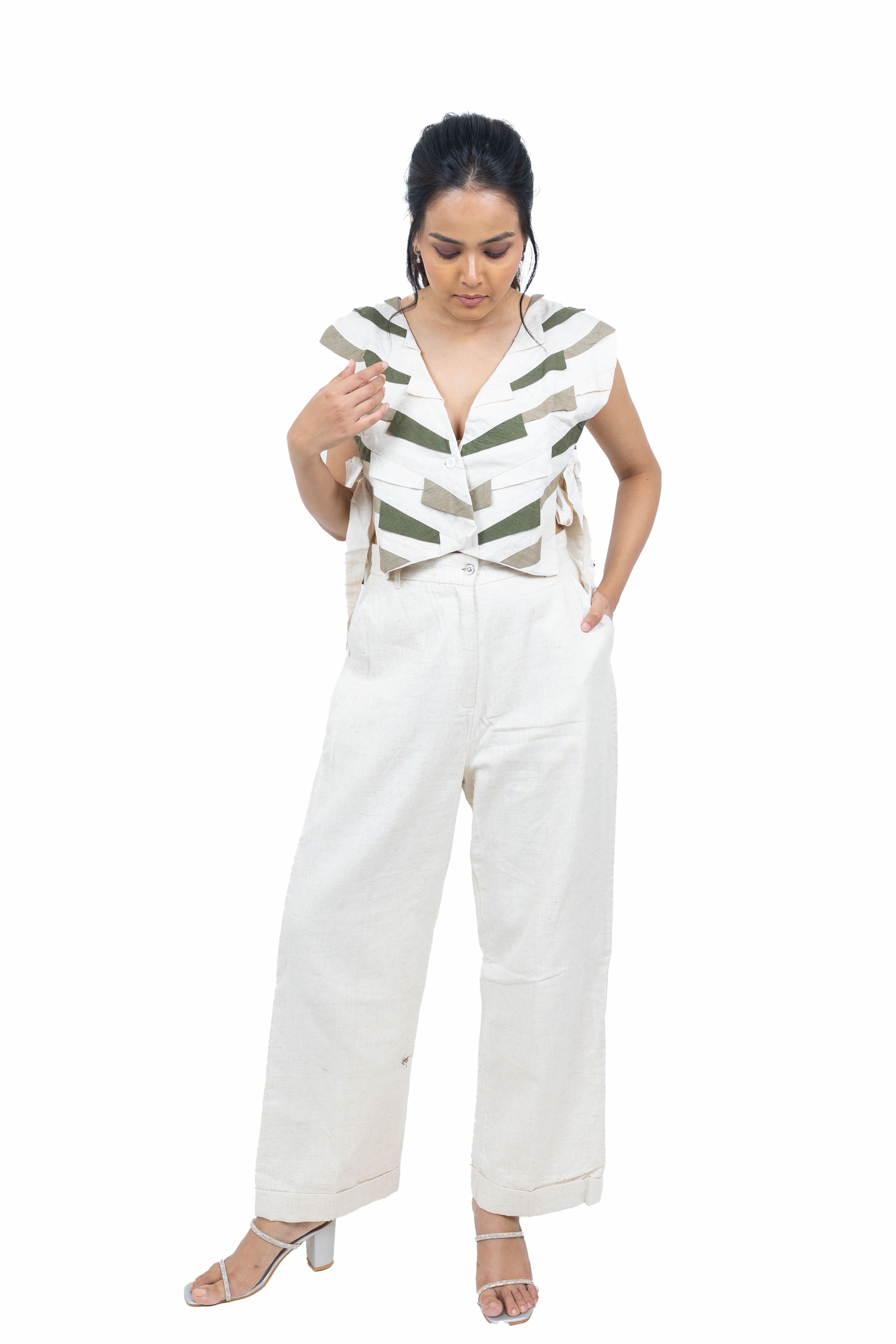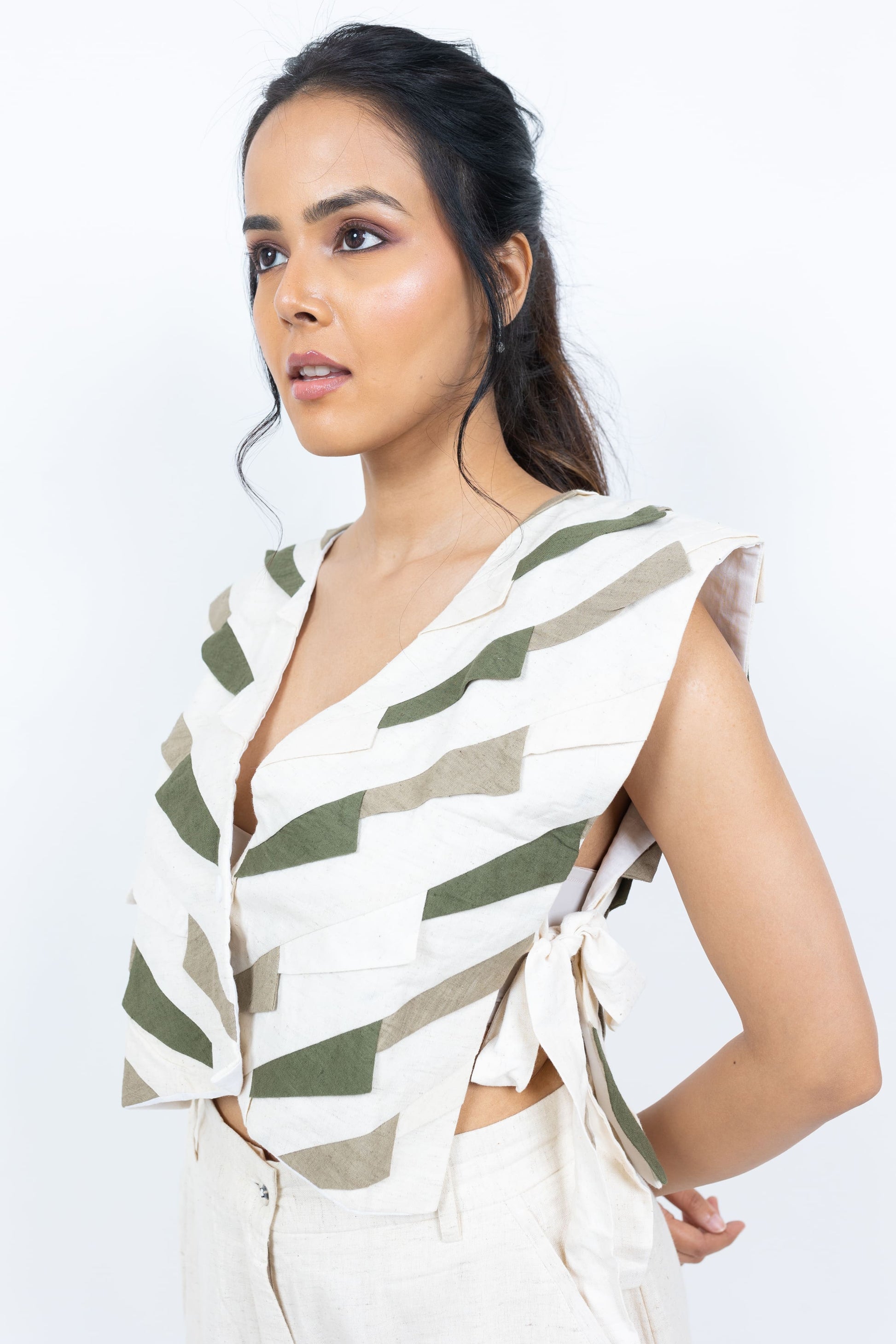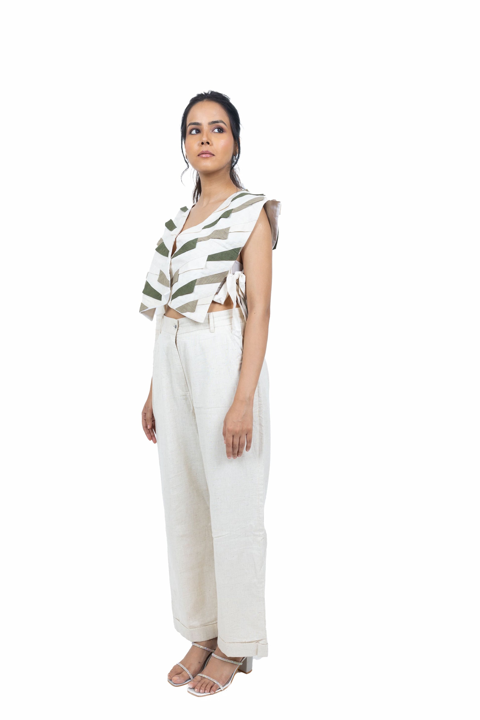 Elevate your wardrobe with this handcrafted handloom jacket, featuring striking patchwork in two-tone hues. Designed with a front button closure and side knots for a unique adjustable fit, it pairs beautifully with shirts, tops, or blouses for a chic layered look