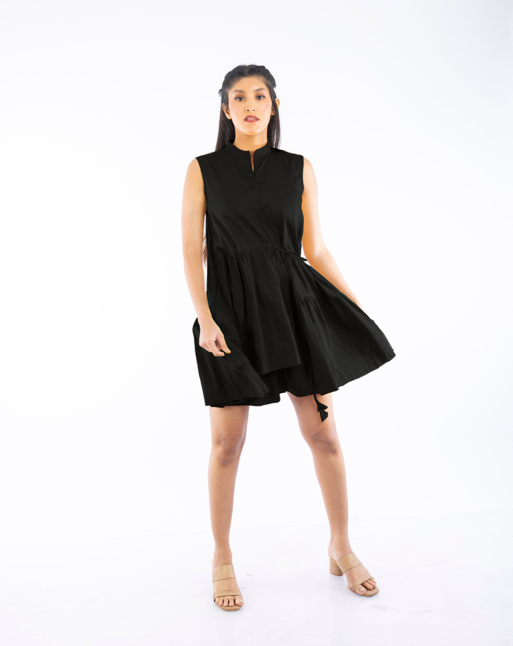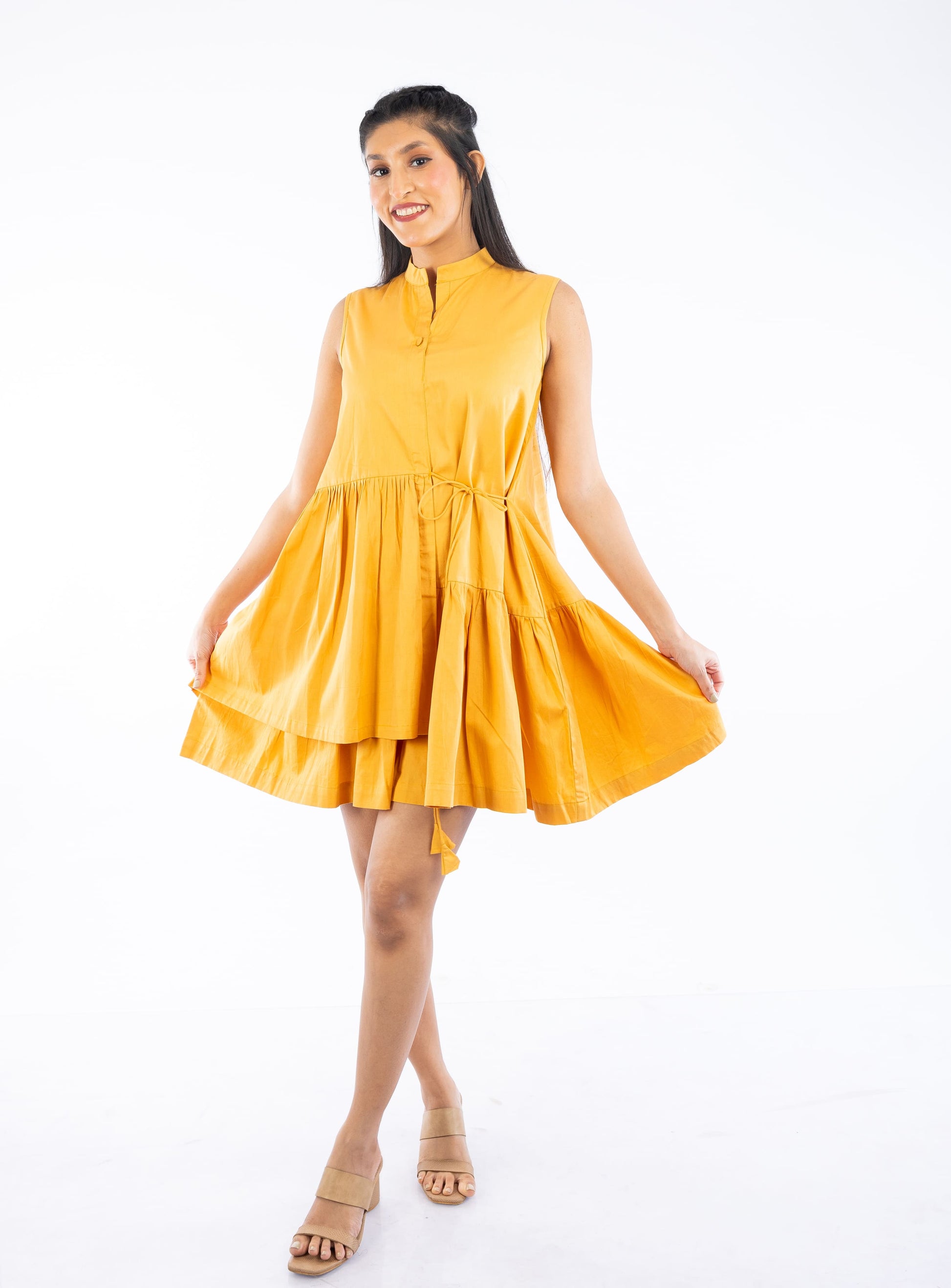 Charm in simplicity with our Yellow Sleeveless Cotton Knot Dress. This short, chic piece features a loose fit, stylish knot detail at the waist, and a layer of overlapping gathers. Buttoned till the waist for a playful touch. Effortless style for any occasion.